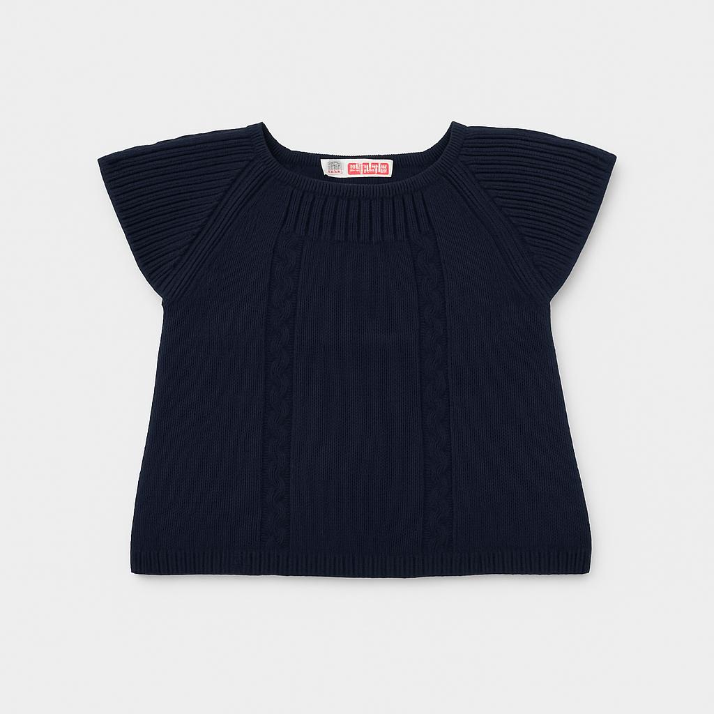 Questo adorabile maglione in tinta unita navy è perfetto per le giornate fresche! Con una delicata lavorazione a trecce, aggiunge un tocco di eleganza al look della tua piccola. Le maniche corte e il taglio leggermente svasato lo rendono comodo senza compromettere lo stile. Realizzato in un tessuto morbido, è l'ideale da abbinare a jeans o leggings per un outfit casual ma ricercato. Nonostante sia un capo usato, si presenta in ottime condizioni e pronto a regalare calore e charme alle piccole fashioniste!
