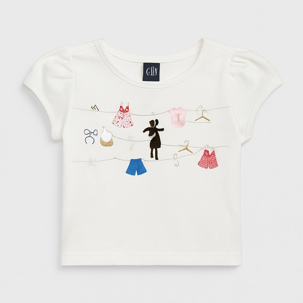 Questa adorabile t-shirt bianca è un vero must-have per il guardaroba delle piccole fashioniste! Realizzata in morbido cotone, presenta un design creativo con deliziosi ricami di abiti e accessori vari, perfetti per stimolare la fantasia. Le maniche corte e leggermente arricciate aggiungono un tocco dolce e chic, mentre il taglio comodo garantisce libertà di movimento per tutte le avventure quotidiane. Nonostante sia usata, si presenta in ottime condizioni, pronta a far brillare il sorriso di chi la indossa! Ideale per creare look freschi e originali.