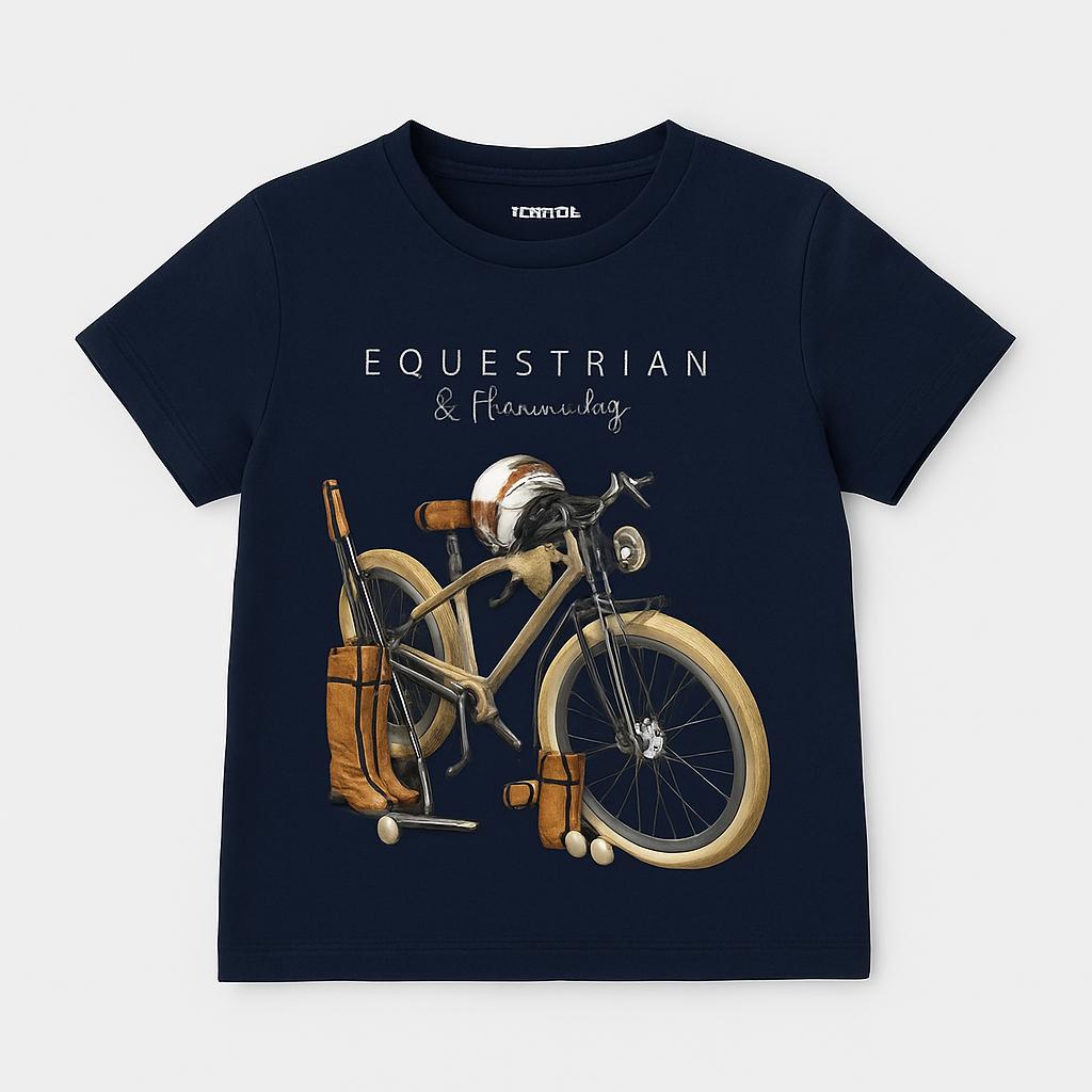 Questa t-shirt di Mayoral è perfetta per i piccoli amanti degli sport all'aria aperta! Realizzata in cotone morbido e confortevole, presenta un affascinante tema equestre con una bicicletta stilizzata e accessori da equitazione. Il colore blu scuro porta un tocco di eleganza e facilita abbinamenti versatili. Ideale per le giornate di avventura, giochi o semplicemente per un look casual e alla moda. Nonostante sia un capo usato, si presenta in ottime condizioni, pronta a vestire ogni piccolo esploratore con stile!