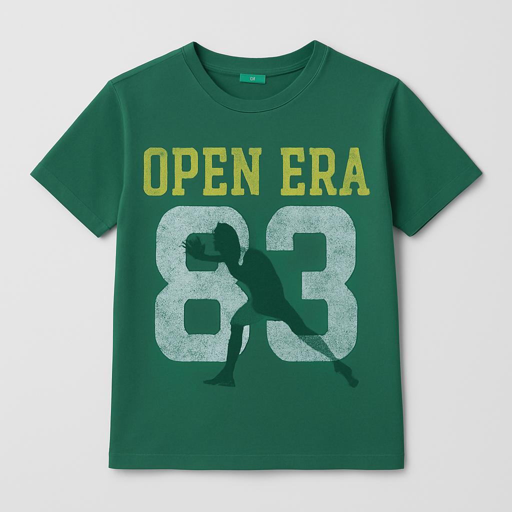 Questa simpatica t-shirt verde è perfetta per i piccoli sportivi in erba! Con un vivace design 'OPEN ERA 83' in lettere bold, porta un tocco di energia e spirito avventuroso. Realizzata in cotone morbido, offre un comfort ottimale per giocare e divertirsi tutto il giorno. Le maniche corte e il taglio classico garantiscono una vestibilità ideale per le giornate più calde. Nonostante sia un capo usato, si presenta in buone condizioni, rendendola un'aggiunta fantastica e trendy al guardaroba dei tuoi bimbi!