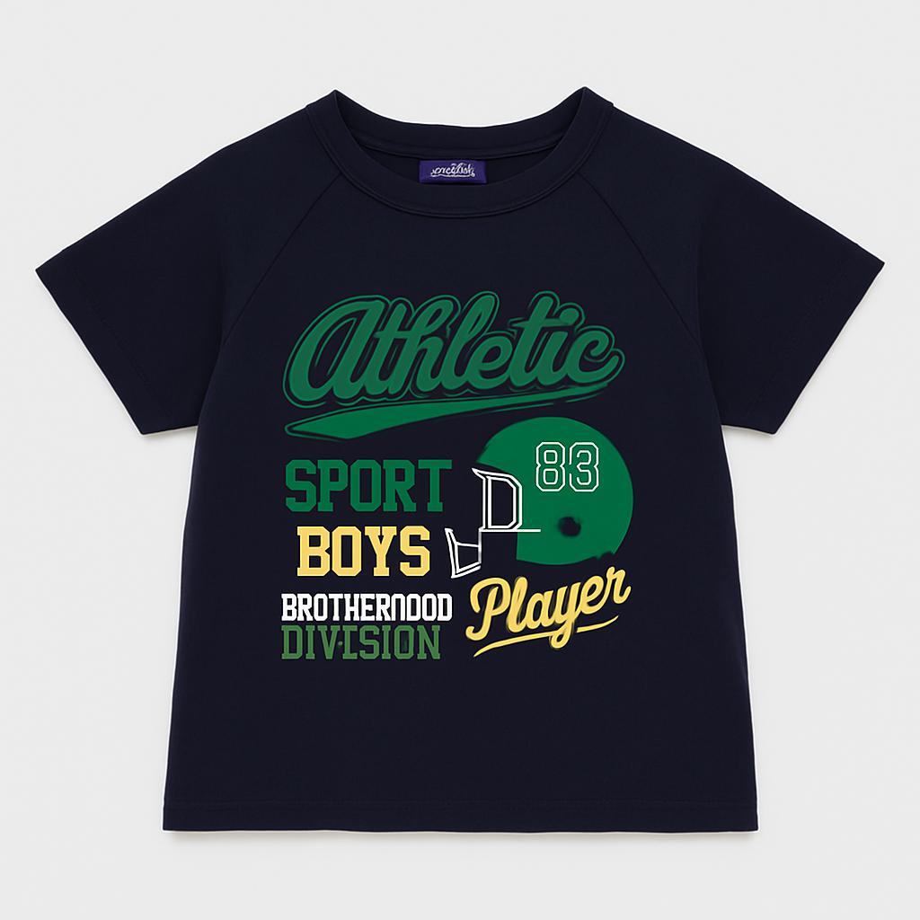 Questa t-shirt sportiva, di colore blu scuro, è perfetta per i piccoli amanti del gioco! Con una simpatica grafica che celebra il mondo dello sport, presenta scritte colorate e un adorabile casco da football. Le maniche corte e il taglio casual la rendono ideale per attività all'aperto, giochi con gli amici o semplicemente per un look trendy. Nonostante sia un capo usato, è in buone condizioni e pronta a dare vita a nuove avventure. Un must-have per i piccoli campioni!