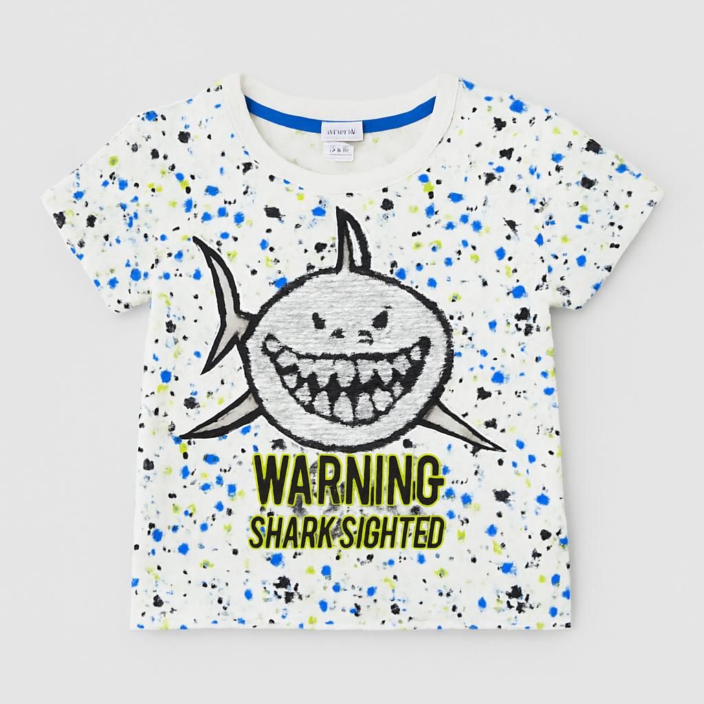Fai brillare il guardaroba del tuo piccolo con questa t-shirt super divertente! Caratterizzata da una vivace stampa di squali, è decorata con scintillanti paillettes che daranno un tocco speciale a ogni avventura. Il design bianco è animato da schizzi di colore blu e verde, rendendola perfetta per i giovani esploratori. Con il messaggio “WARNING SHARK SIGHTED” in evidenza, questa maglietta è ideale per chi ama il mare e il divertimento. Realizzata in morbido cotone, offre comfort e libertà di movimento. Un capo usato in ottime condizioni, pronto per nuove avventure!