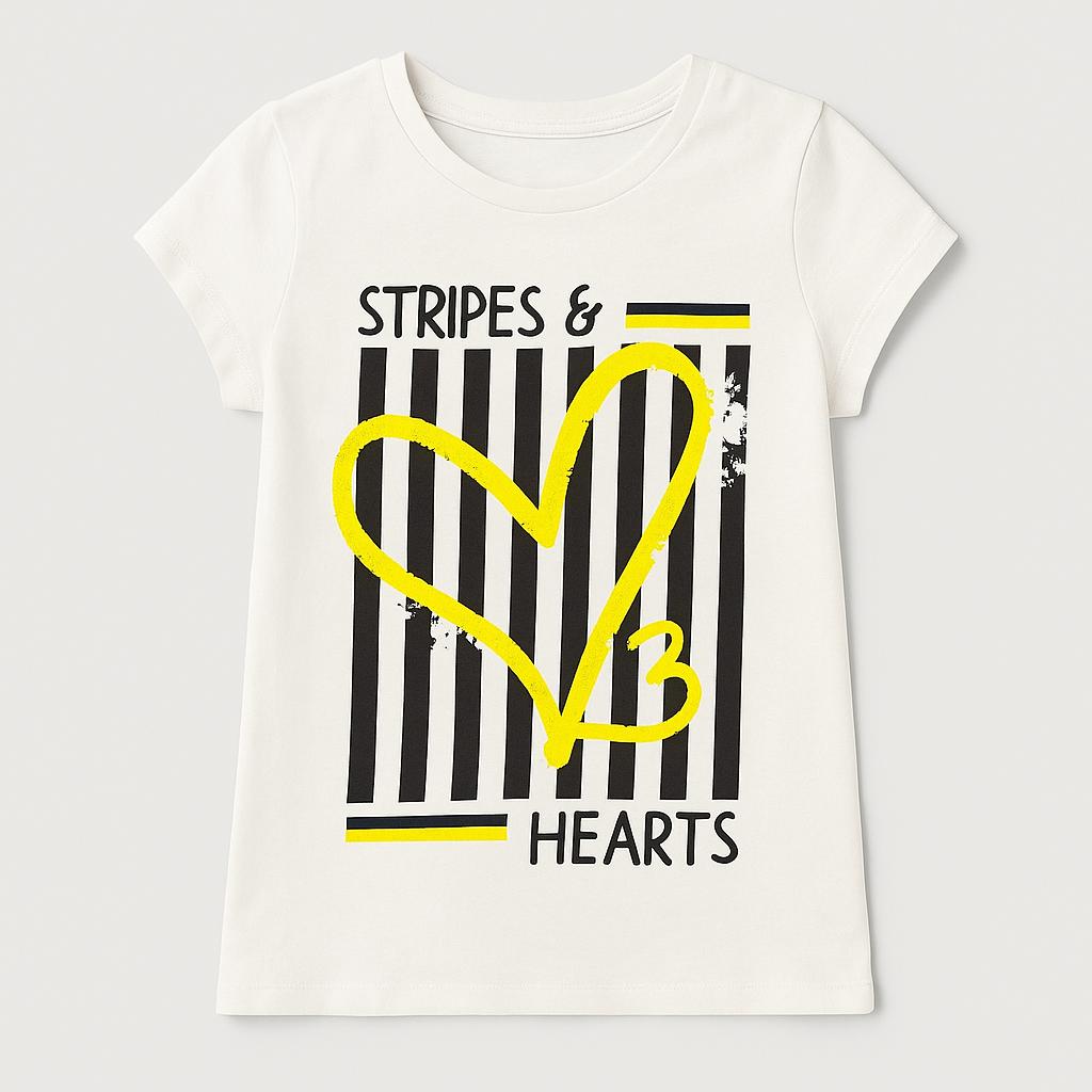 Questa adorabile t-shirt bianca è un vero colpo di fulmine per le piccole fashioniste! Con un design vivace che combina strisce nere e un grande cuore giallo brillante, trasmette un messaggio di allegria e amore. Realizzata in cotone morbido, questa maglietta assicura comfort e freschezza durante le calde giornate estive. Le maniche corte e il taglio leggermente sfiancato la rendono perfetta per giocare o semplicemente per un look casual e trendy. Nonostante sia un capo usato, si presenta in ottime condizioni, pronta per essere indossata da una piccola sperimentatrice di stile!