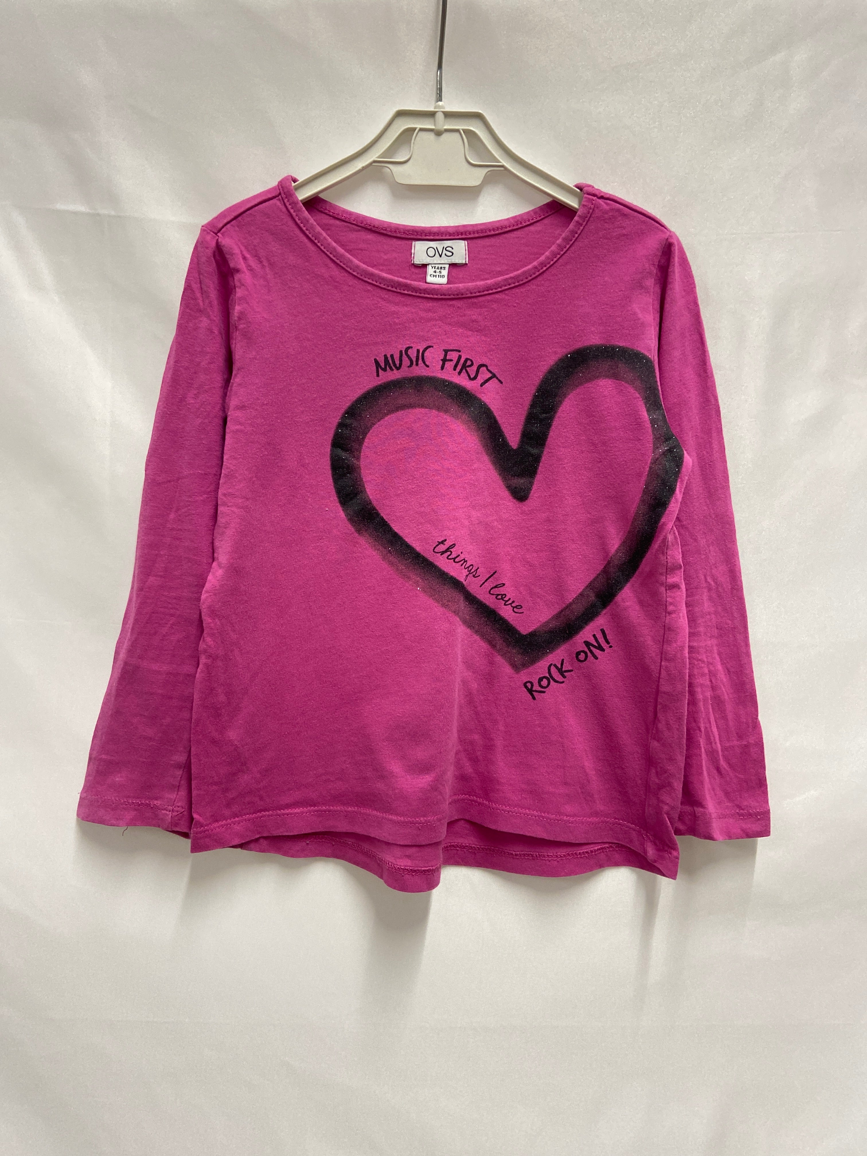 Questa adorabile t-shirt di marca OVS è un vero colpo di fulmine per le piccole amanti della musica! Realizzata in morbido cotone di un vivace colore magenta, la maglietta presenta un grande cuore nero stampato sul davanti con la scritta “MUSIC FIRST” e “ROCK ON!” che sprigiona un’energia positiva.