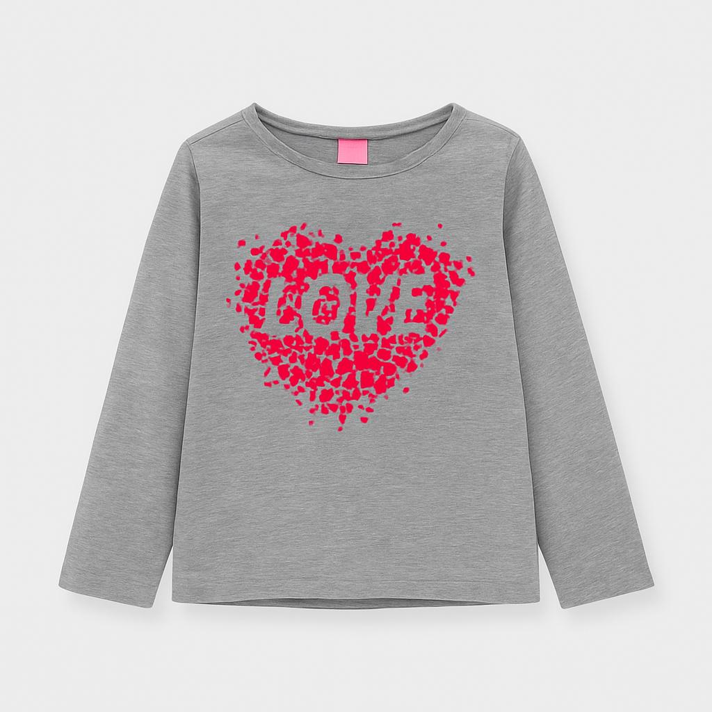 Questa adorabile maglietta a maniche lunghe è pronta per far sorridere la tua piccola! Realizzata in morbido cotone grigio, presenta un grande cuore formato da splendidi cuori rossi e la scritta "LOVE", perfetta per esprimere dolcezza e affetto. Il taglio comodo e il tessuto leggero la rendono ideale per giocare o per una giornata al parco. Leggermente usata, è ancora in ottime condizioni e pronta a diventare il nuovo preferito del guardaroba! Un capo perfetto per le giovani romantiche!