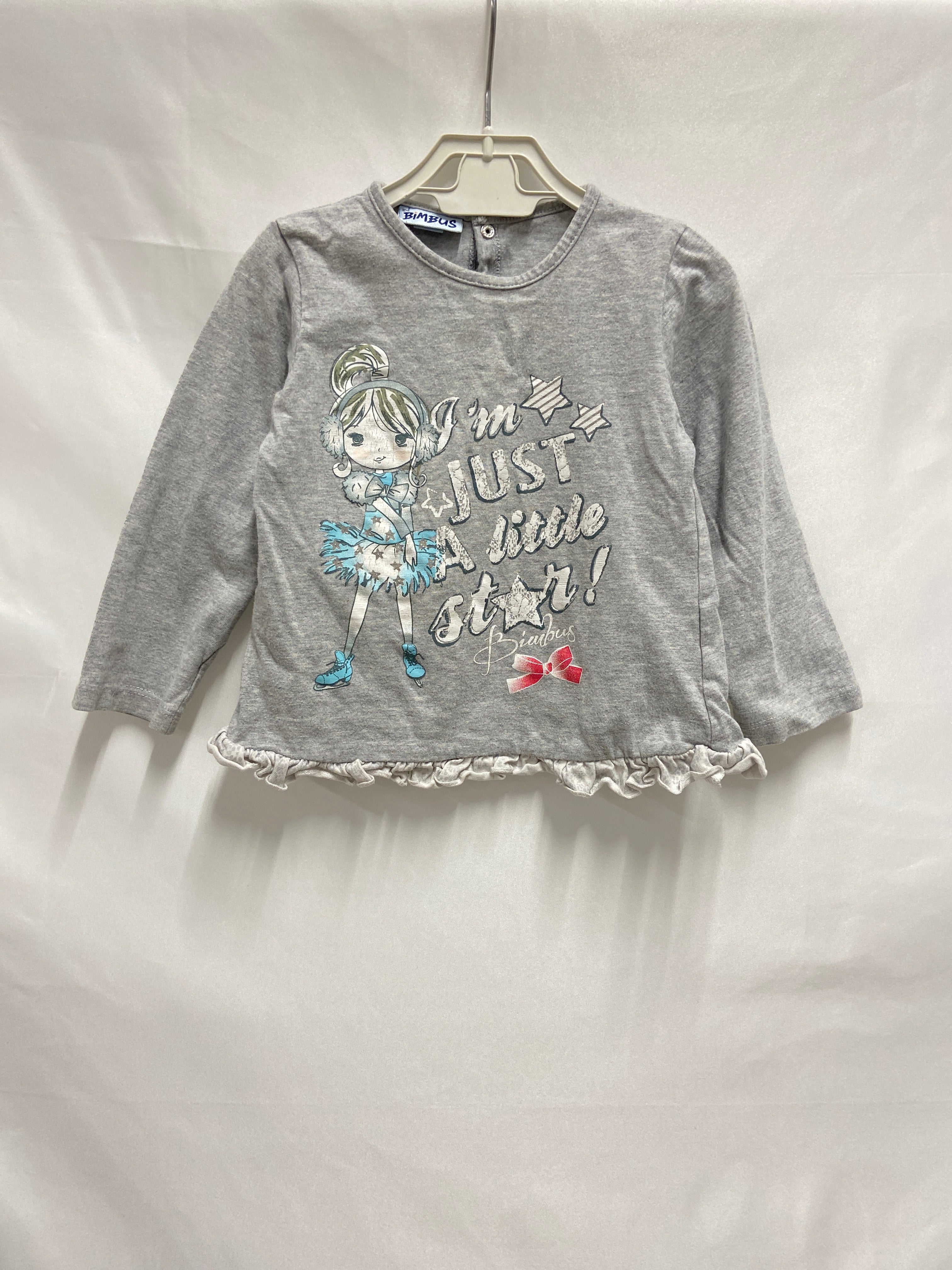 Questa adorabile maglietta grigia è perfetta per le piccole stelle! Con un delizioso design che festeggia la bellezza dell'essere "Just a little star!", cattura subito l'attenzione. La stampa vivace presenta una ballerina che danza su una nuvola di stelle, arricchita da dettagli scintillanti. Le maniche lunghe la rendono ideale per le giornate fresche, mentre il bordo con rouches aggiunge un tocco femminile e giocoso. Nonostante sia un capo usato, è in buone condizioni e pronto a far brillare il guardaroba della tua piccola. Un must per le piccole sognatrici!