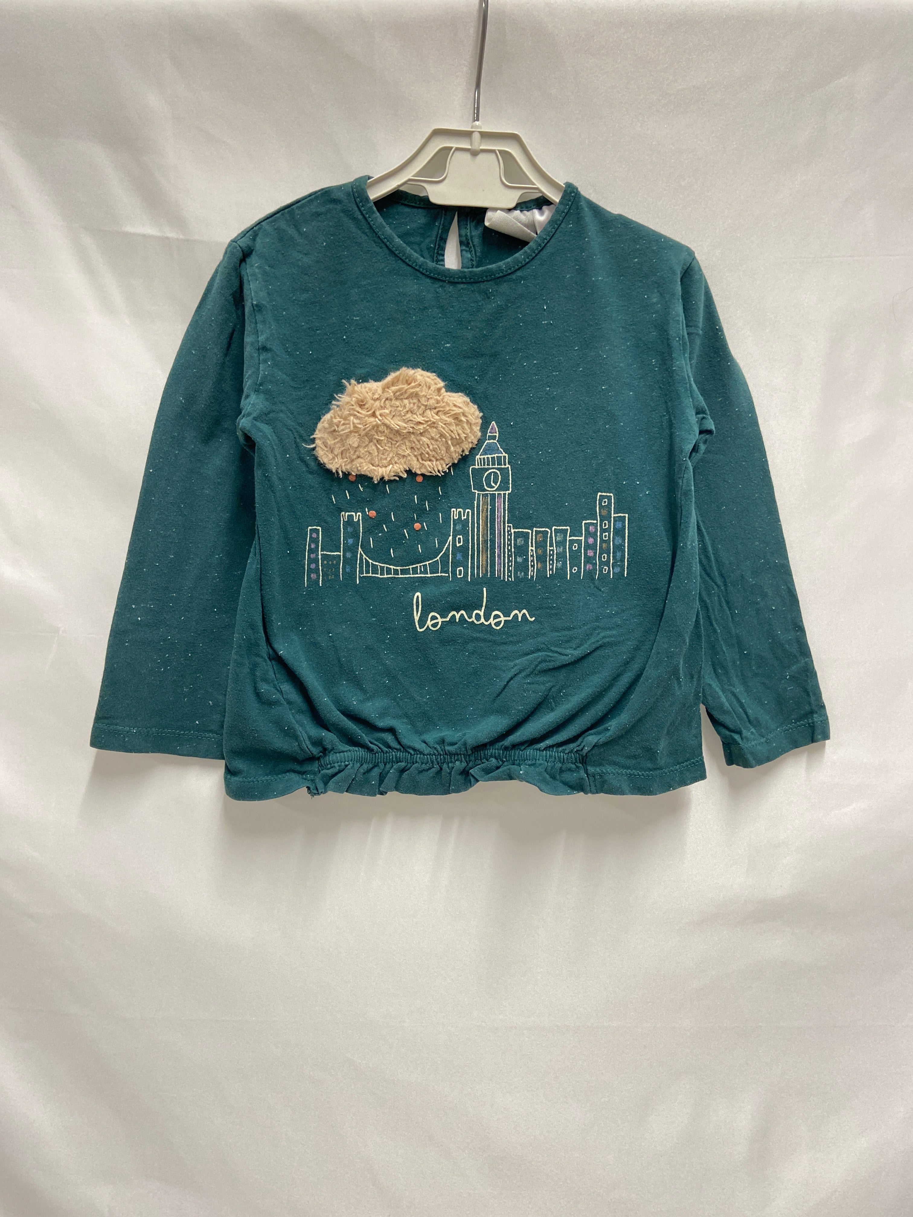Questa adorabile maglietta in verde ottanio porta un tocco di Londra nel guardaroba della tua piccola! Realizzata in morbido cotone, presenta un grazioso design con nuvole e gocce di pioggia ricamate, accompagnate da un'illustrazione della skyline londinese. Il delicato dettaglio in peluche sulla nuvola rende questo capo unico e accogliente. Con maniche lunghe e un taglio svasato, è perfetta per le giornate fresche, offre comfort e stile. Nonostante sia usata, è in ottime condizioni e pronta per accompagnare le avventure quotidiane della tua bambina!