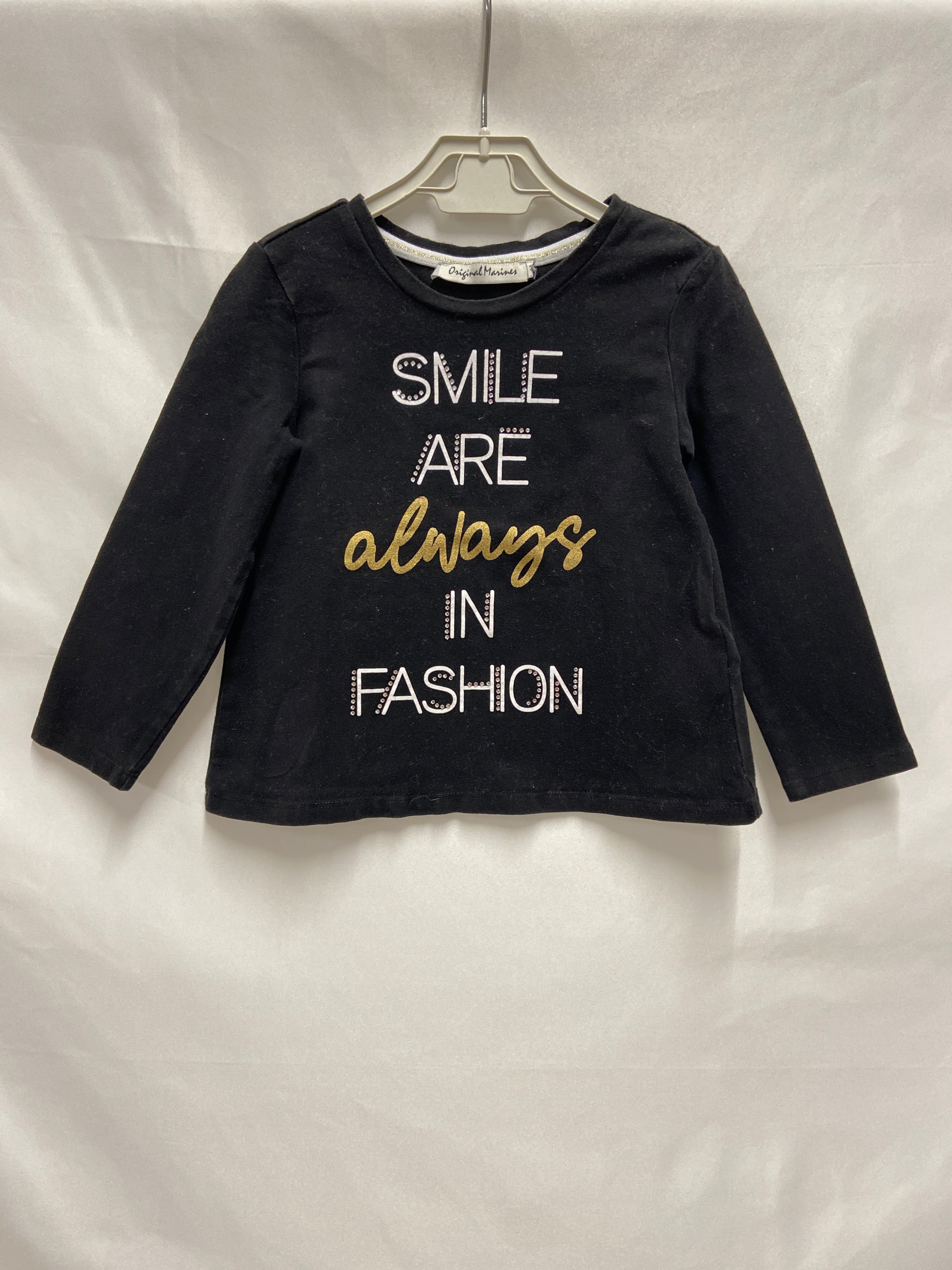 Questa simpatica maglia a maniche lunghe è perfetta per le piccole trendsetter! Di un elegante nero, è arricchita da una scritta colorata "SMILE ARE ALWAYS IN FASHION", che porta un messaggio positivo e alla moda. Realizzata in un tessuto morbido e confortevole, offre una vestibilità comoda per ogni avventura. Che sia per la scuola o una giornata di giochi, questa maglietta è un'ottima scelta per esprimere il proprio stile. Nonostante sia un capo usato, si presenta in ottime condizioni, pronta a far brillare il look della tua piccola!