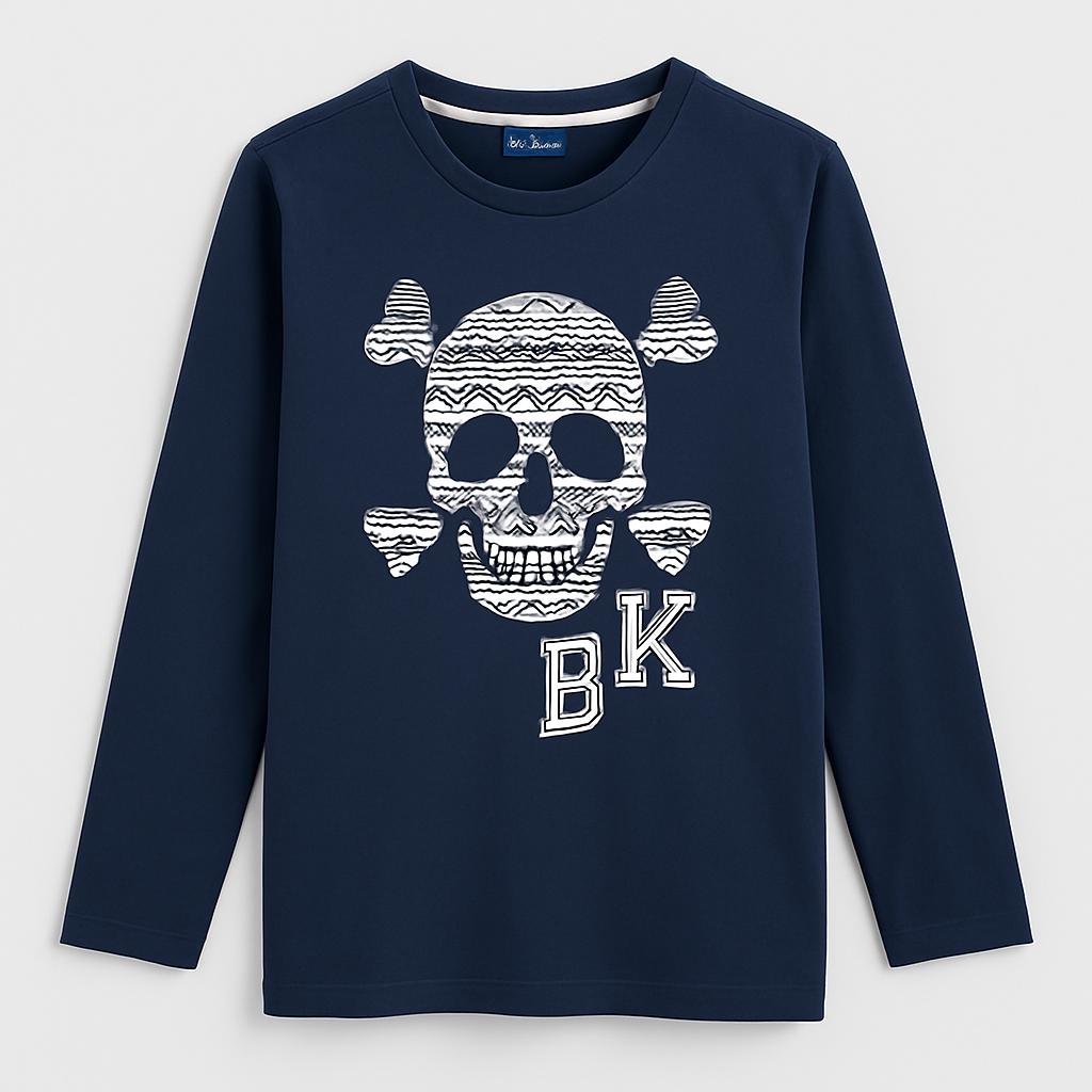 Questa maglietta a maniche lunghe di colore blu navy è un vero must per i piccoli pirati in erba! Con un'originale stampa di teschio e ossa incrociate, aggiunge un tocco avventuroso e audace al guardaroba. Il morbido cotone garantisce comfort per tutta la giornata, ideale per esplorare, giocare e divertirsi. La lettera "K" ricamata sul davanti conferisce un ulteriore stile, perfetta per i piccoli amanti della moda. Nonostante sia usata, si presenta in ottime condizioni, pronta per nuove avventure!