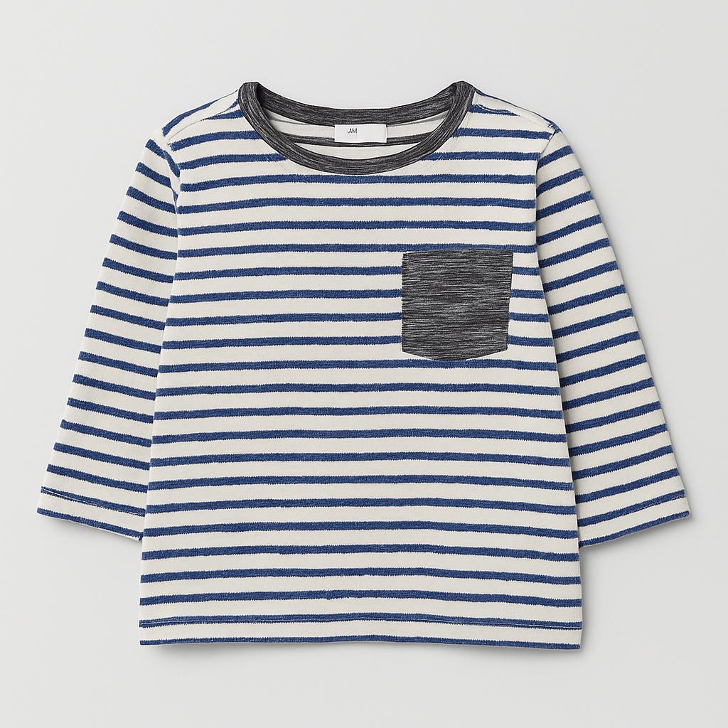 Questa adorabile maglietta a righe è un'aggiunta versatile e trendy al guardaroba del tuo bambino! Realizzata in un morbido tessuto, presenta una chic combinazione di righe blu e bianche, con una graziosa taschina grigia sul petto. Le maniche lunghe offrono comfort e stile, perfette per le fresche giornate primaverili o autunnali. Nonostante sia un capo usato, si presenta in ottime condizioni, pronta per accompagnare le avventure quotidiane del tuo piccolo. Un must-have per i giovani fashionisti che amano esprimere la loro personalità!