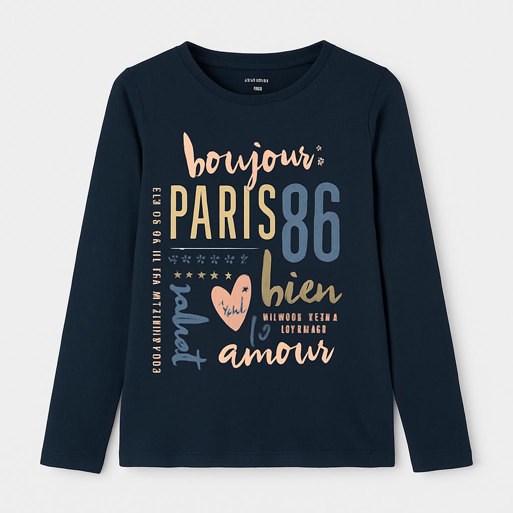 Questa adorabile maglietta a maniche lunghe porterà un tocco di eleganza al guardaroba della tua piccola! Di un raffinato blu scuro, la maglia è decorata con un vivace design ispirato a Parigi, con scritte in colori metallici e un cuore rosa che la rende unica. Realizzata con un tessuto morbido e confortevole, è perfetta per le giornate fresche, garantendo stile e comodità. Anche se usata, si presenta in ottime condizioni e sarà un'aggiunta preziosa per le piccole che amano sognare in grande!