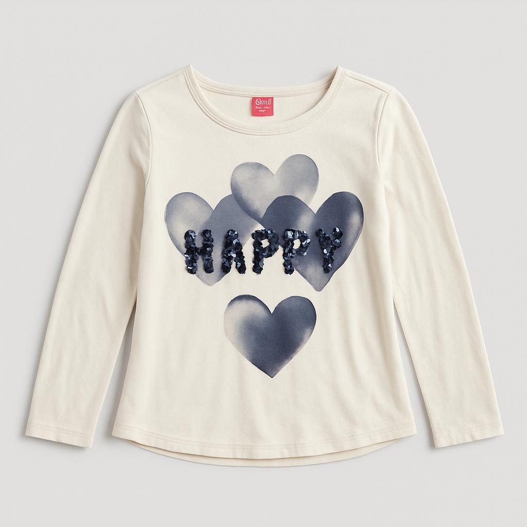 Questa dolcissima maglietta lunga a maniche è perfetta per le piccole sognatrici! In un delicato colore chiaro, presenta un irresistibile design con cuori sfumati e brillanti paillette che scrivono "HAPPY". Il suo taglio morbido e leggermente svasato garantisce comfort e libertà di movimento, ideale per ogni avventura quotidiana. Adatta a ogni stagione, questa maglietta usata si presenta in buone condizioni, pronta a regalare a ogni outfit un pizzico di allegria. Un capo che non può mancare nel guardaroba delle piccole fashioniste!