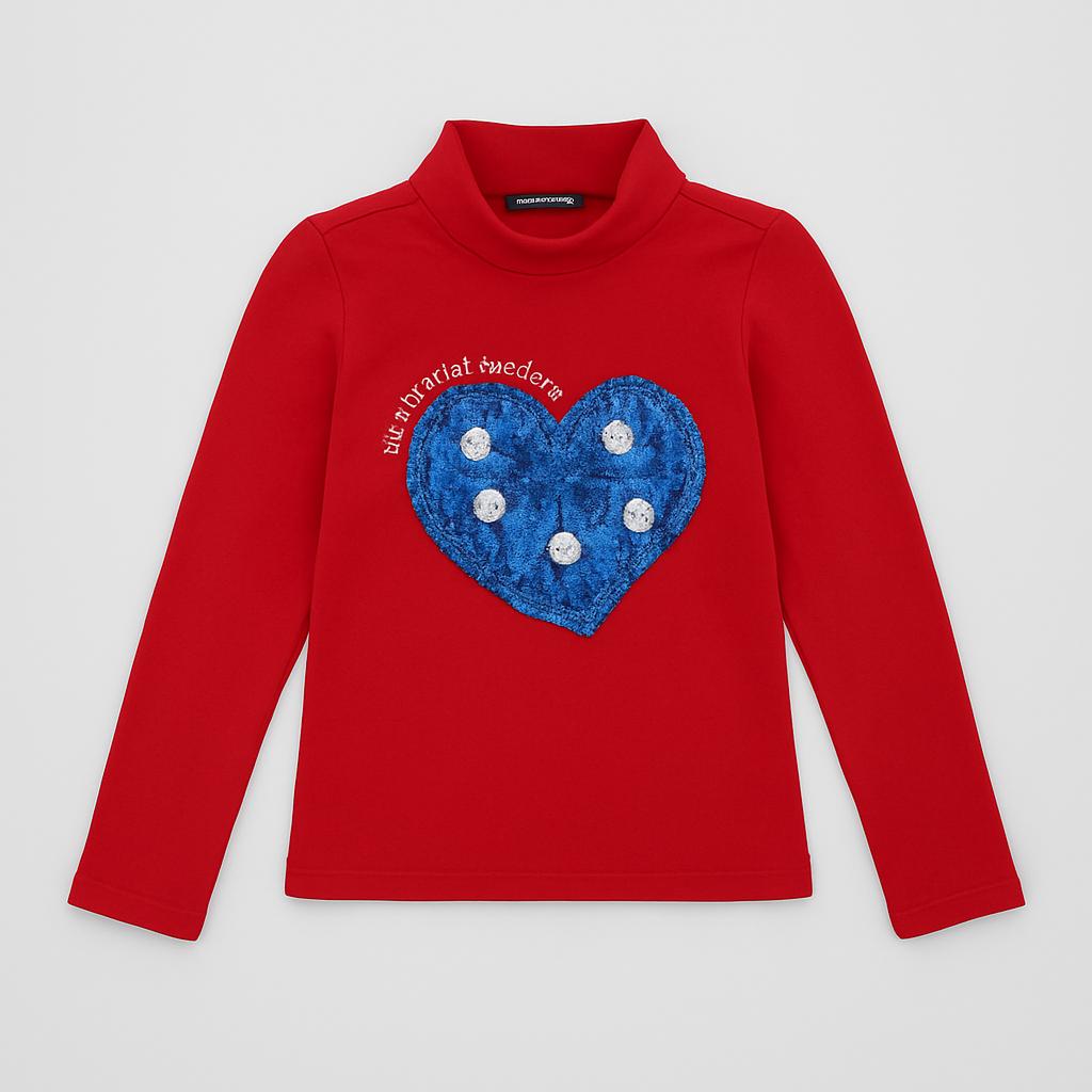 Questa meravigliosa maglietta a maniche lunghe rossa è perfetta per le piccole amanti della moda! Realizzata in un morbido cotone, è caratterizzata da un originale cuore di paillettes blu che cambia colore a seconda della luce. Il colletto alto aggiunge un tocco elegante, rendendola ideale per le giornate più fresche. Anche se usata, si presenta in ottime condizioni e promette di portare allegria e stile nel guardaroba della tua bambina. Un capo versatile e trendy, perfetto per qualsiasi occasione!