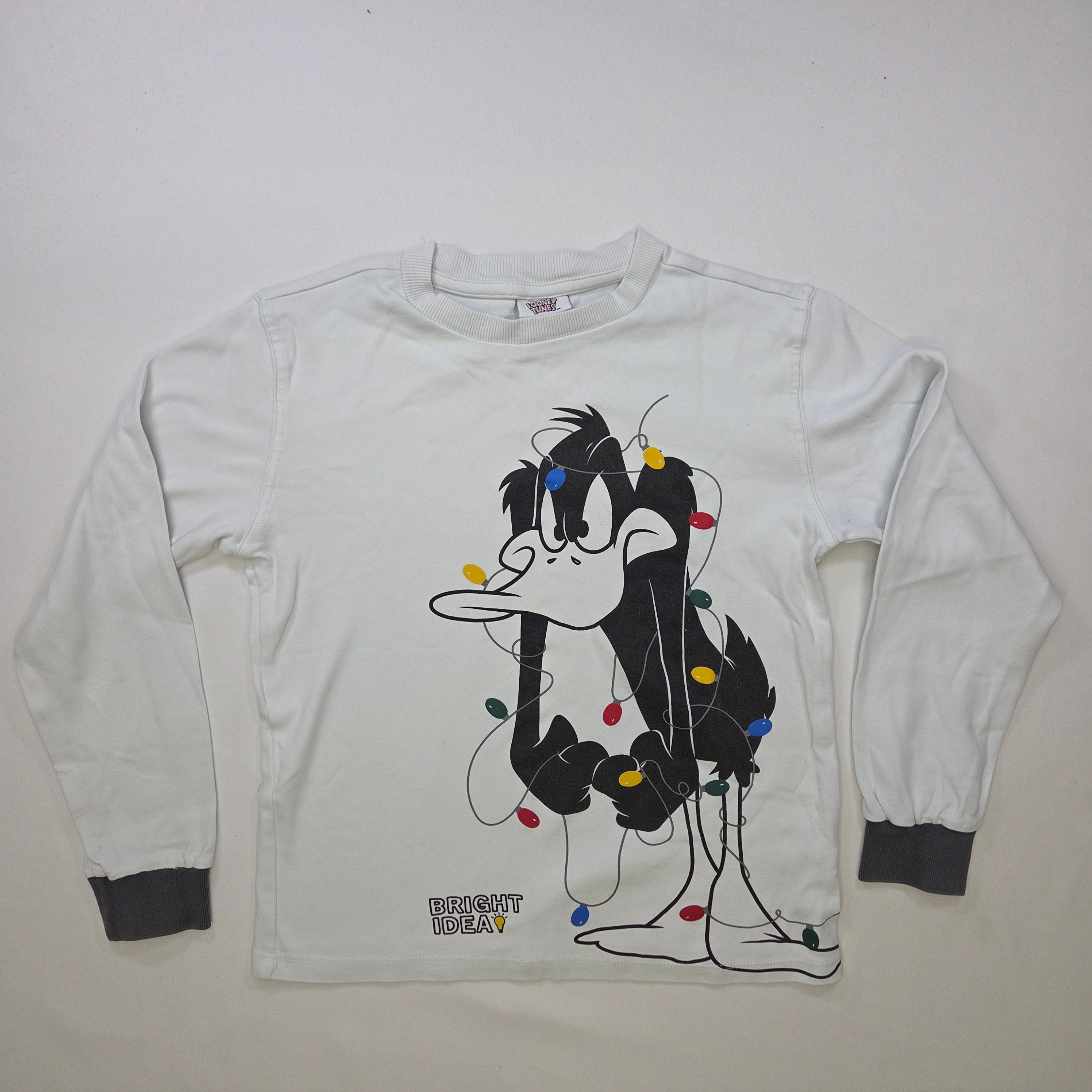 Questa adorabile maglietta a maniche lunghe con Duffy Duck è perfetta per i piccoli amanti dei cartoni animati! Realizzata in un caldo cotone, il morbido tessuto assicura comfort durante le giornate più fresche. Il design mostra Duffy in una divertente posa, decorato con luci colorate, che regala un tocco festivo e giocoso. I polsini in contrasto aggiungono un dettaglio di stile, rendendo questo capo un’ottima scelta per le avventure quotidiane o le serate in famiglia. Anche se usata, è in buone condizioni e pronta a regalare sorrisi e divertimento!