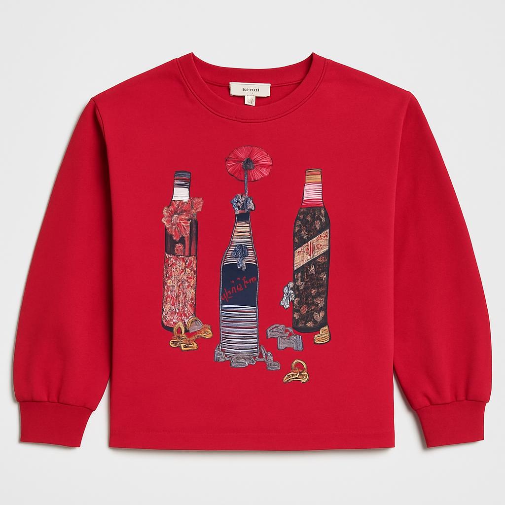 Questa simpatica felpa rossa è perfetta per le piccole trendsetter! Con un originale design che presenta bottiglie decorate e un tocco di glitter, catturerà l'attenzione di tutti. Realizzata in morbido cotone, garantisce comfort e libertà nei movimenti. Le maniche lunghe la rendono ideale per le fresche giornate primaverili e autunnali. Nonostante sia un capo usato, si presenta in ottime condizioni, pronta per accompagnare avventure e giochi. Un'aggiunta vivace e divertente al guardaroba delle bambine che amano esprimere la loro personalità!