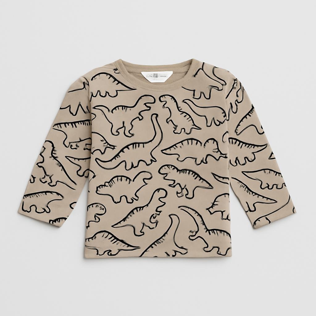 Ecco la t-shirt perfetta per i piccoli amanti dei dinosauri! Realizzata in morbido cotone, questa maglietta presenta un divertente design con silhouette di dinosauri in nero su sfondo beige, che stimola la fantasia. Le maniche lunghe la rendono ideale per le giornate fresche, perfetta per avventure indoor e outdoor. Nonostante sia un capo usato, è in ottime condizioni e pronta a far vivere nuove avventure al tuo bambino. Aggiungi un tocco preistorico al guardaroba del tuo piccolo!
