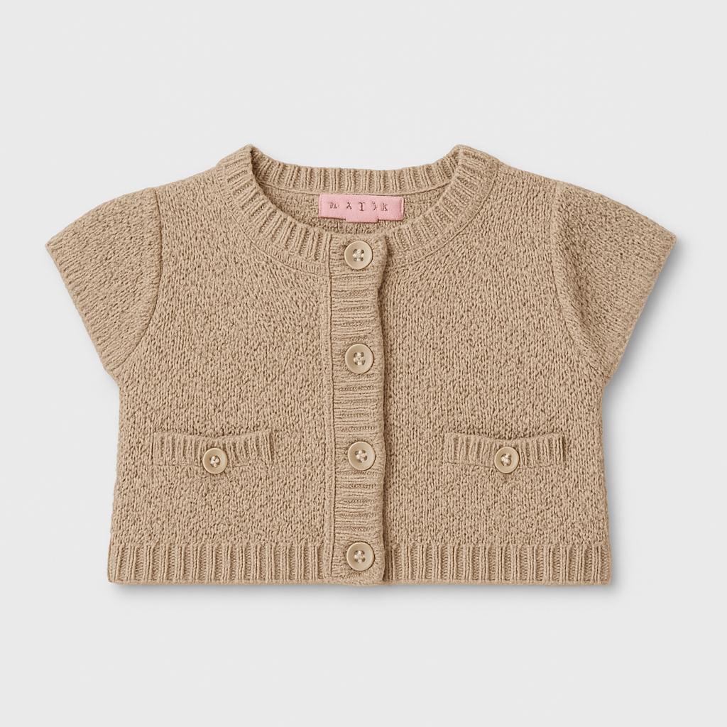 Questo adorabile cardigan a maniche corte in tonalità beige è un'aggiunta perfetta al guardaroba della tua piccola! Realizzato in morbido filato, è perfetto per le fresche serate primaverili o le giornate autunnali. Le pratiche tasche anteriori e i pulsanti in tonalità coordinate aggiungono un tocco di fascino e funzionalità. Nonostante sia un capo usato, si presenta in ottime condizioni, rendendolo ideale per creare look eleganti e casual. Con il suo design semplice e versatile, sarà sicuramente il compagno ideale per ogni outfit della tua bambina!