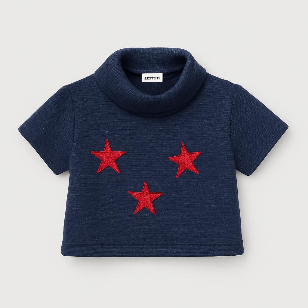 Questo adorabile maglione corto blu notte è perfetto per le piccole stelle! Realizzato in un morbido tessuto glitterato, presenta un elegante colletto a funnel e tre stelle rosse scintillanti sul davanti, che aggiungono un tocco di brillantezza e originalità. Ideale per le occasioni speciali o per un look trendy e casual, questo capo usato è in ottime condizioni e si abbina facilmente a jeans o gonne. Un tocco di magia per il guardaroba delle piccole!