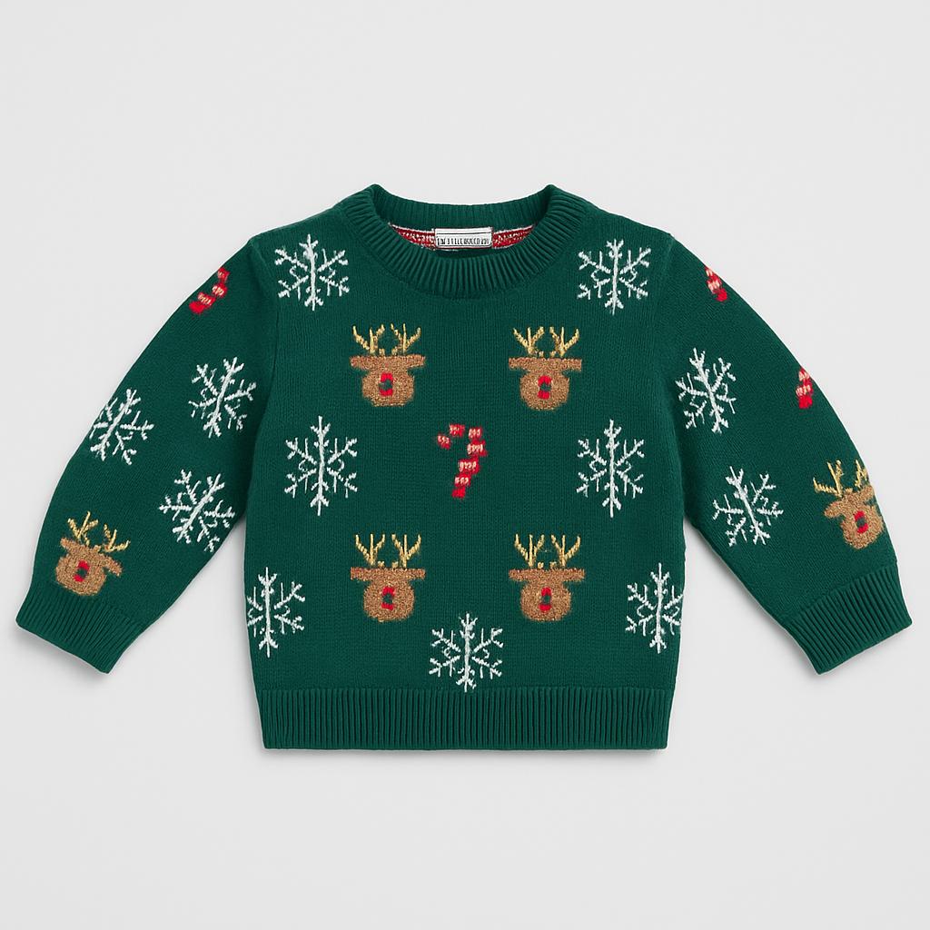 Questo adorabile maglione natalizio è perfetto per rendere le festività ancora più speciali! Realizzato in soffice maglia di cotone, presenta un vivace verde bosco adornato con simpatici renne, fiocchi di neve e bastoncini di zucchero che sprigionano un'atmosfera festosa. Le maniche lunghe e il collettoclassico garantiscono comfort e calore durante le fredde giornate invernali. Nonostante sia un capo usato, si trova in ottime condizioni ed è ideale per i piccoli che amano brillare durante le celebrazioni natalizie. Un must-have per il guardaroba invernale dei più piccoli!