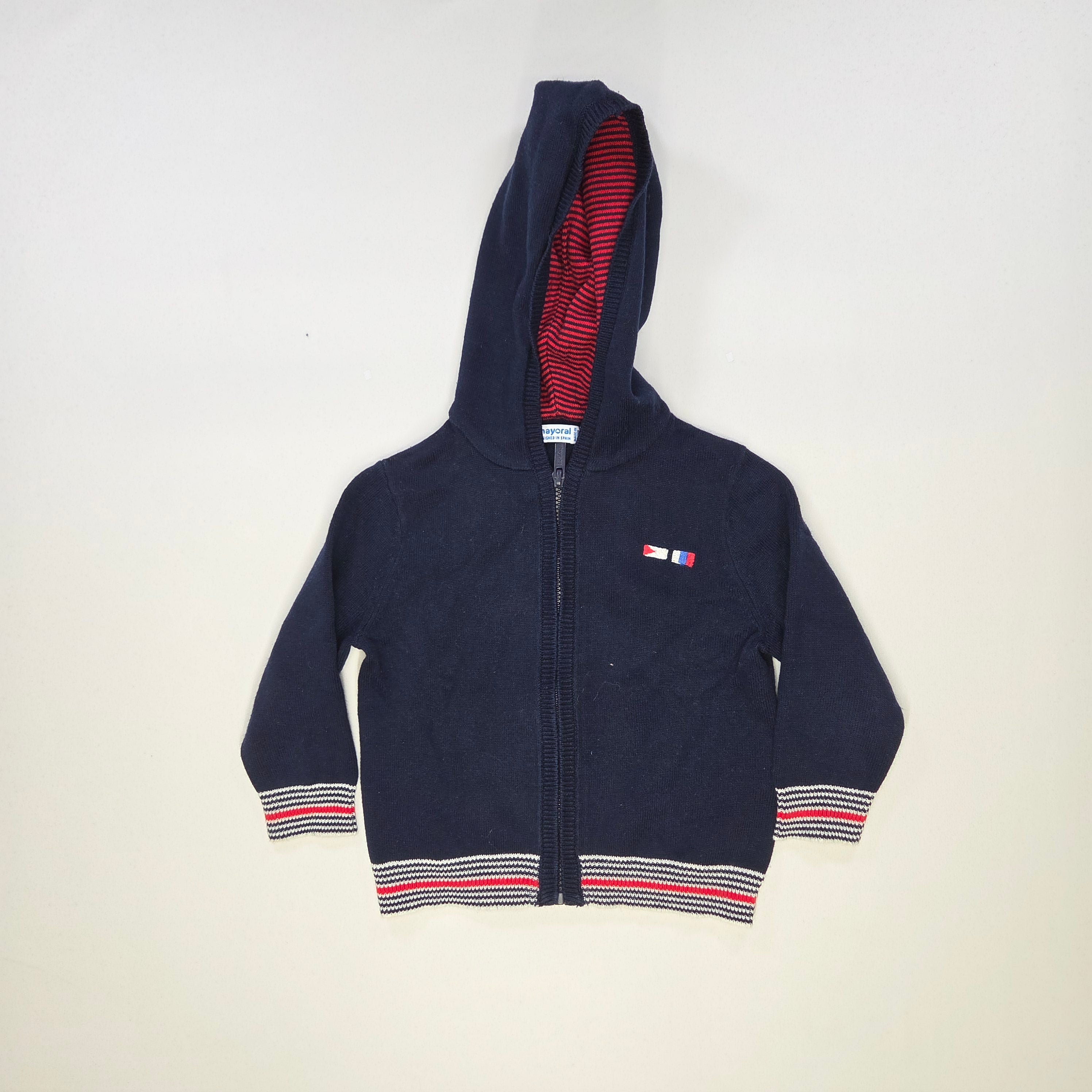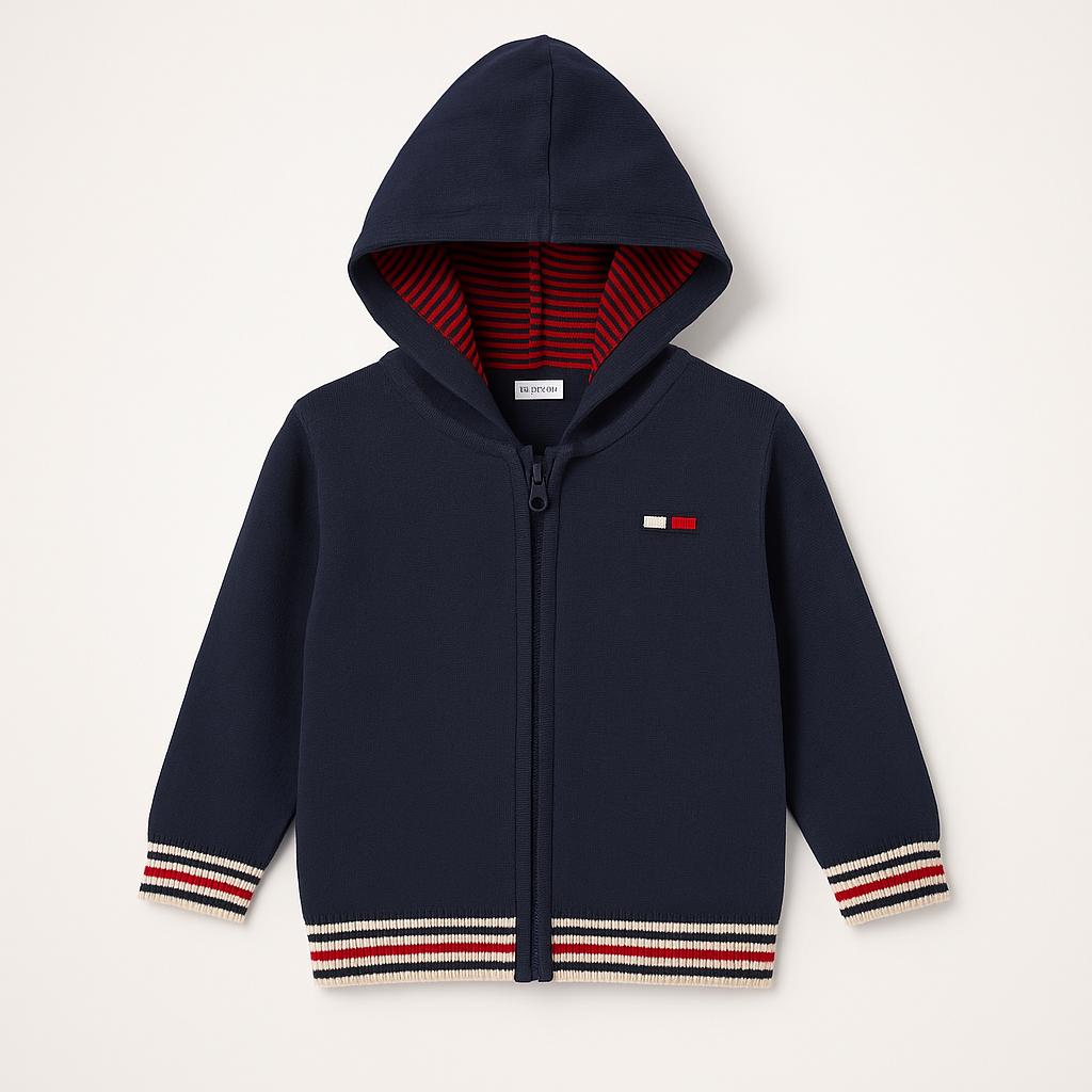 Questo delizioso cardigan con cappuccio della marca Tommy Hilfiger è un capo perfetto per il guardaroba del tuo piccolo! Realizzato in un caldo tessuto, presenta una bellissima tonalità blu navy, arricchita da dettagli a righe rosse e bianche sul bordo. L'apertura con zip e il cappuccio lo rendono ideale per le fresche giornate primaverili e le serate estive. Nonostante sia usato, è in ottime condizioni e mantiene il suo fascino originale. Un'opzione versatile e trendy, perfetta per ogni piccola avventuriera che ama esplorare il mondo con stile!