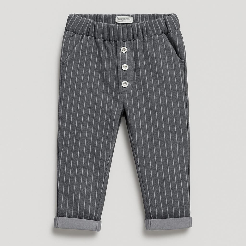 Questi adorabili pantaloni a righe sono l'aggiunta perfetta al guardaroba del tuo bambino! Realizzati in un morbido tessuto, offrono comfort e stile per ogni occasione. La tonalità grigia elegante è decorata con righe bianche, donando un tocco di originalità. La vita elastica con bottoni è pratica e permette una vestibilità regolabile, mentre il fondo risvoltato aggiunge un elemento trendy. Questi pantaloni, pur essendo usati, sono in ottime condizioni e pronti per accompagnare le avventure quotidiane del tuo piccolo!