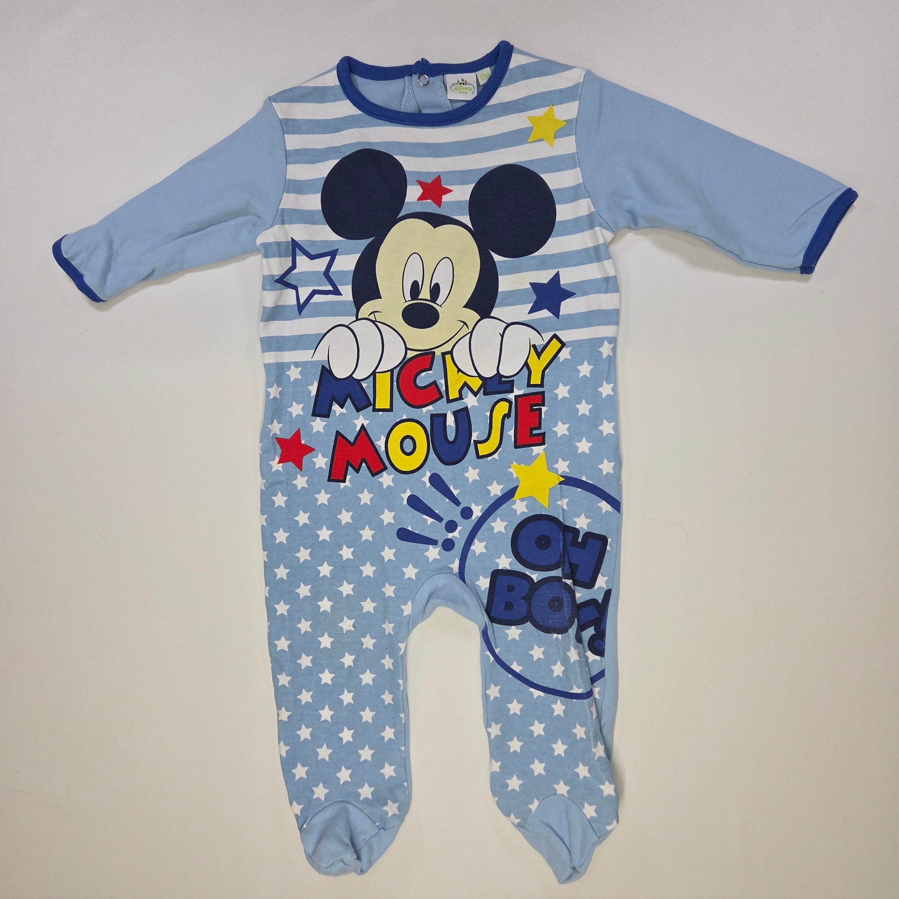 Questo adorabile pagliaccetto di Mickey Mouse è perfetto per i piccoli fan del famoso topo! Realizzato in morbido cotone, il design presenta un fresco blu con righe e stelle bianche, adornato da un vivace Mickey che saluta con gioia. Le maniche lunghe e il comodo bottoncino neutro rendono facile il cambio, mentre il taglio ampio garantisce libertà di movimento per le piccole avventure giornaliere. Nonostante sia usato, è in ottime condizioni ed è ideale per far brillare con stile il guardaroba del tuo bimbo!