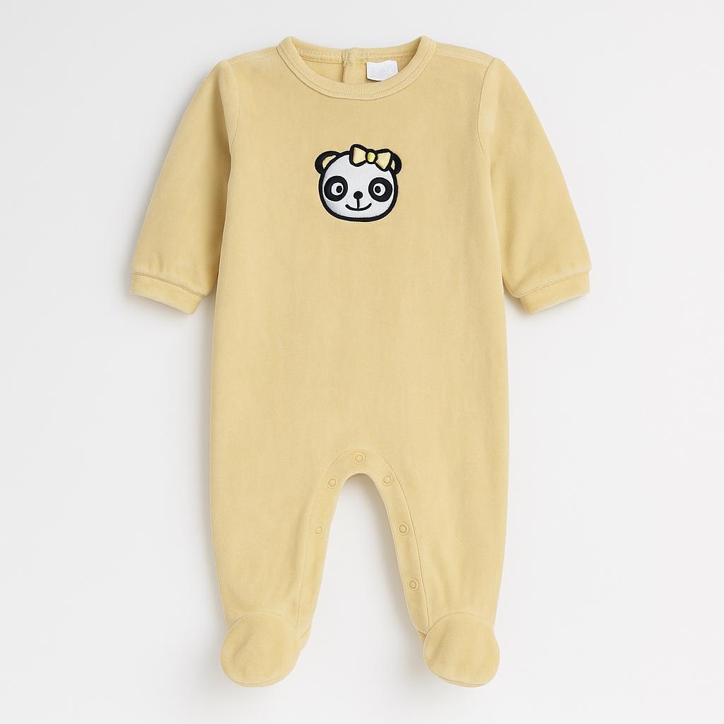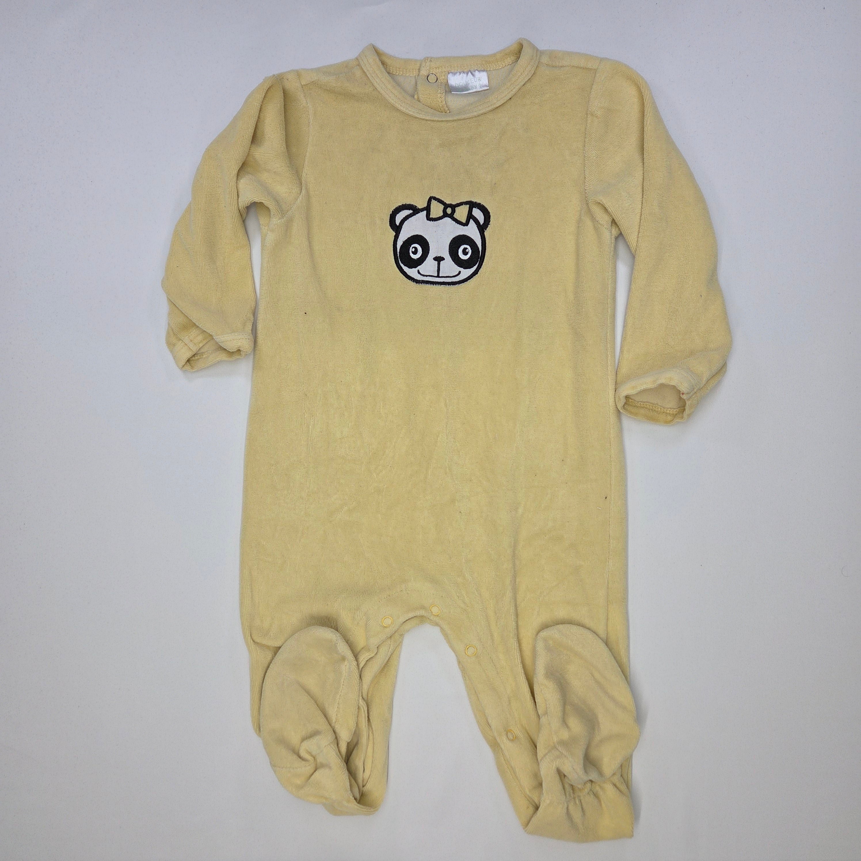 Questo adorabile pagliaccetto giallo è un vero e proprio abbraccio di morbidezza per i più piccoli! Realizzato in un tessuto caldo e accogliente, è decorato con un tenero ricamo di un panda sorridente con un fiocco, che aggiunge un tocco di dolcezza.