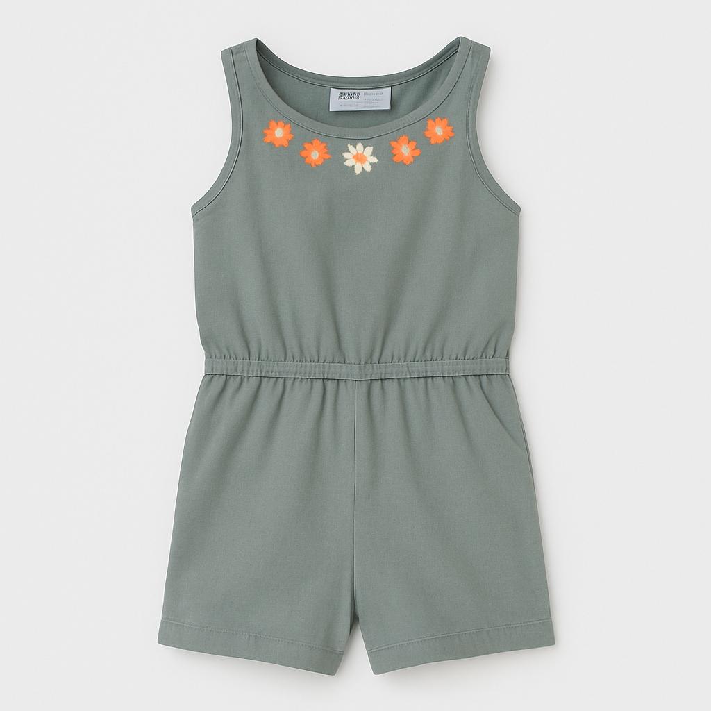 Questo adorabile salopette corto in morbido tessuto di cotone è l'ideale per le calde giornate estive! Con il suo elegante colore verde salvia e i dettagli floreali ricamati sulle spalle, aggiunge un tocco di freschezza al look della tua piccola. La vita regolabile offre una vestibilità comoda e pratica, perfetta per esplorazioni e giochi all'aperto. Nonostante sia un capo usato, si presenta in ottime condizioni, pronto per nuove avventure. Un pezzo versatile e trendy che ogni bambino amerà indossare!