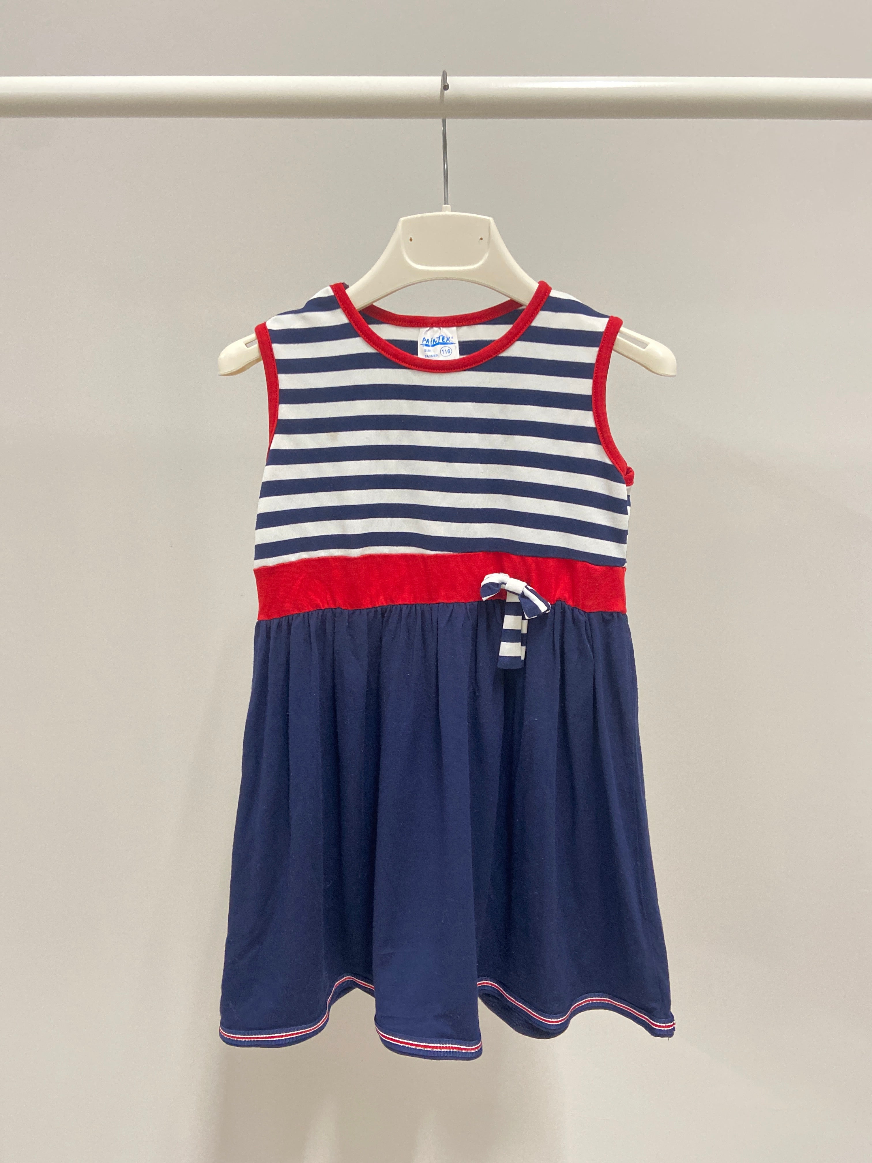 Questo adorabile vestitino estivo è perfetto per le piccole esploratrici! Con una simpatica combinazione di righe bianche e blu, e una vivace fascia rossa in vita, trasmette una freschezza irresistibile. Il design senza maniche garantisce comfort nelle giornate calde, mentre il fiocchetto decorativo aggiunge un tocco di dolcezza. Nonostante sia un capo usato, si presenta in ottime condizioni, pronto a regalare momenti indimenticabili! Un must per ogni piccola trendsetter!