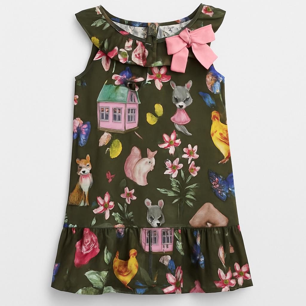 Questo adorabile abito fluttuante è un sogno colorato per le piccole esploratrici! Decorato con un vivace motivo di animali e fiori su uno sfondo verde oliva, cattura l'attenzione con la sua allegria. Il delicato colletto arricciato e il fiocco rosa al collo aggiungono un tocco di femminilità e stile. La gonna svolazzante rende ogni passo un momento di gioia, perfetta per feste o giornate di gioco all'aperto. Nonostante sia un capo usato, si presenta in ottime condizioni e pronto per regalare avventure indimenticabili!
