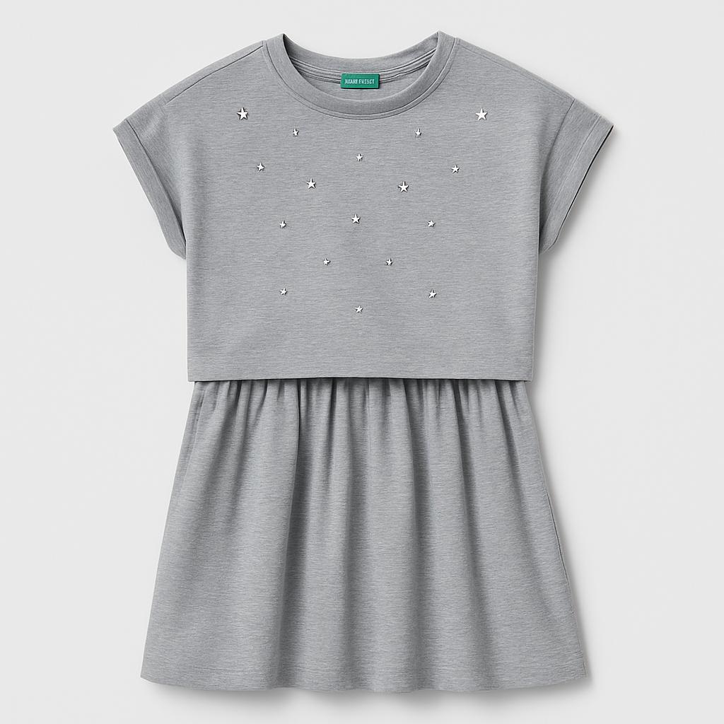 Questo adorabile vestito grigio è perfetto per le piccole sognatrici! Composto da una maglietta corta e una gonna svolazzante, offre uno stile fresco e trendy. Le stelle scintillanti che decorano il davanti aggiungono un tocco di magia e brillantezza, rendendo ogni outfit speciale. La morbida maglia in cotone assicura comfort in ogni occasione, da una giornata al parco a una festa con gli amici. Nonostante sia usato, è in ottime condizioni e pronto per vivere nuove avventure! Una scelta vincente per le bambine che amano divertirsi con eleganza!