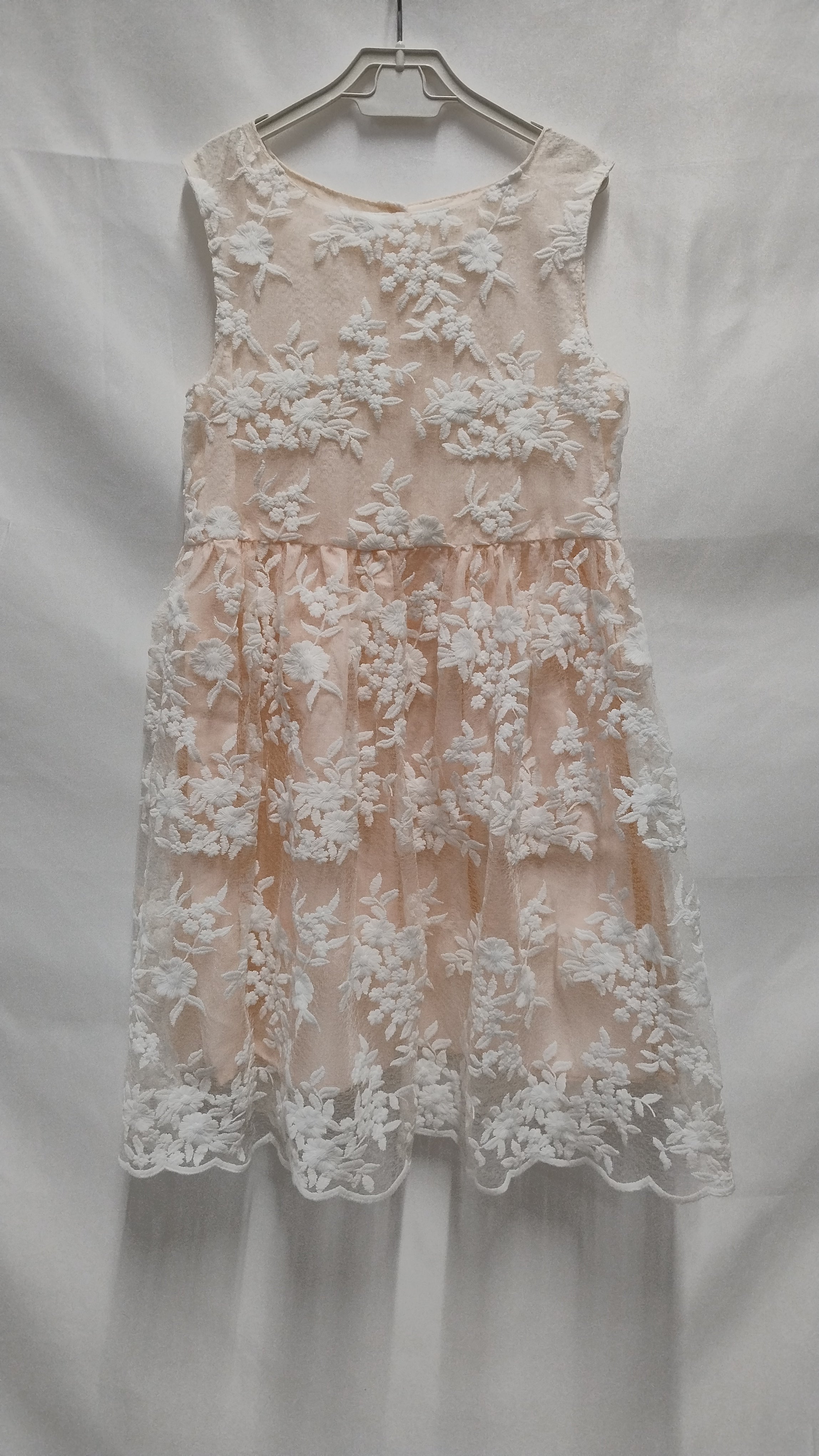 Questo elegante abito per bambina è un vero sogno! Realizzato in un delicato tessuto rosa, è arricchito da splendide applicazioni floreali bianche che creano un effetto romantico e raffinato. La gonna ampia aggiunge un tocco di movimento e leggerezza, perfetta per ballare e divertirsi. Con spalline sottili e un design semplice, è adatto per occasioni speciali, feste o cerimonie. Nonostante sia un capo usato, si presenta in ottime condizioni ed è pronto a rendere speciale ogni momento della tua piccola!