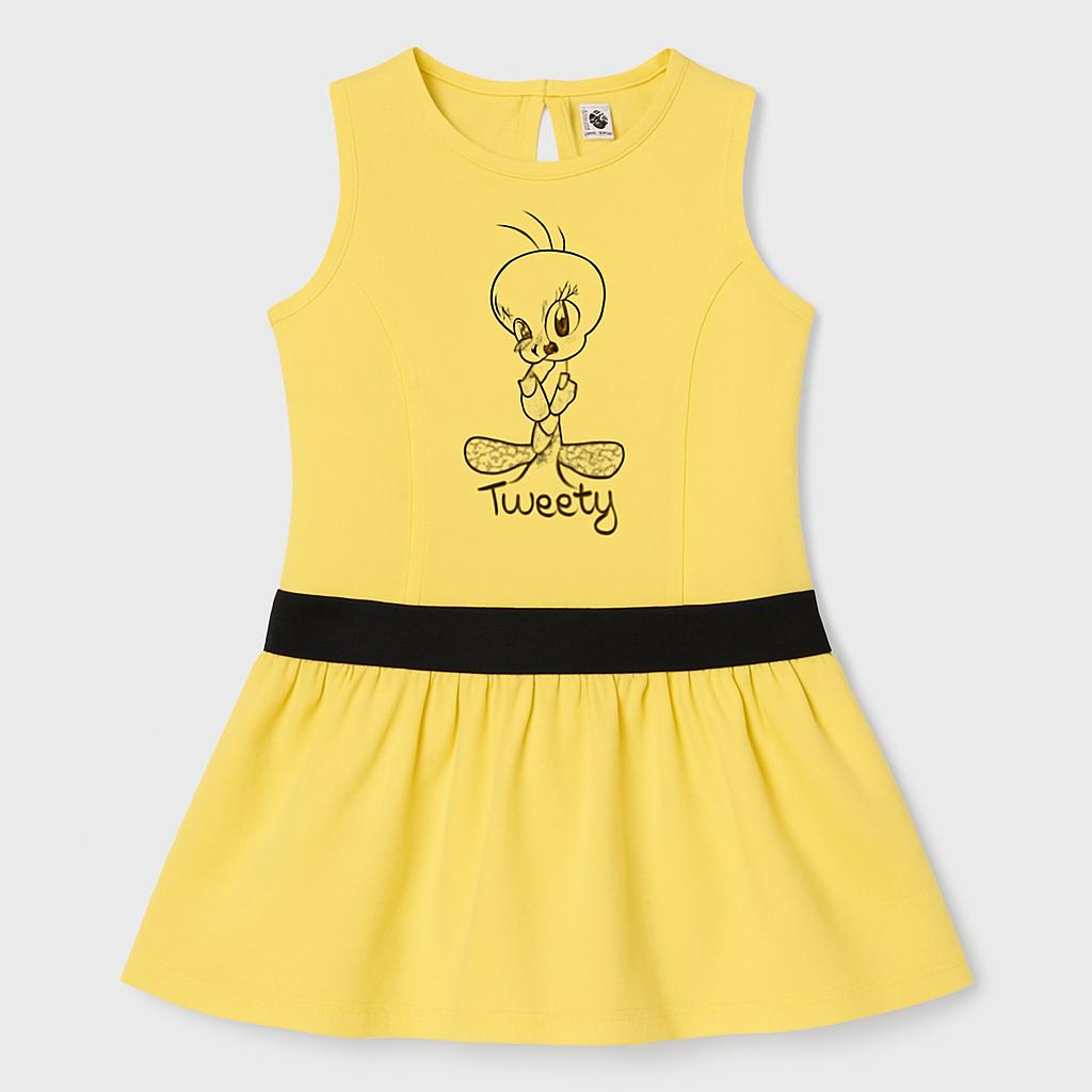Questo adorabile vestitino giallo è perfetto per le piccole fan di Tweety! Realizzato in morbido cotone, presenta una graziosa illustrazione del celebre uccellino che aggiunge un tocco di allegria. La gonna a ruota e la cintura nera in vita creano un look giocoso e trendy, ideale per le avventure di ogni giorno o per una festa. Con uno stile senza maniche, è perfetto per le giornate soleggiate. Nonostante sia un capo usato, è in ottime condizioni ed è pronto a regalare sorrisi e comfort alla tua piccola!