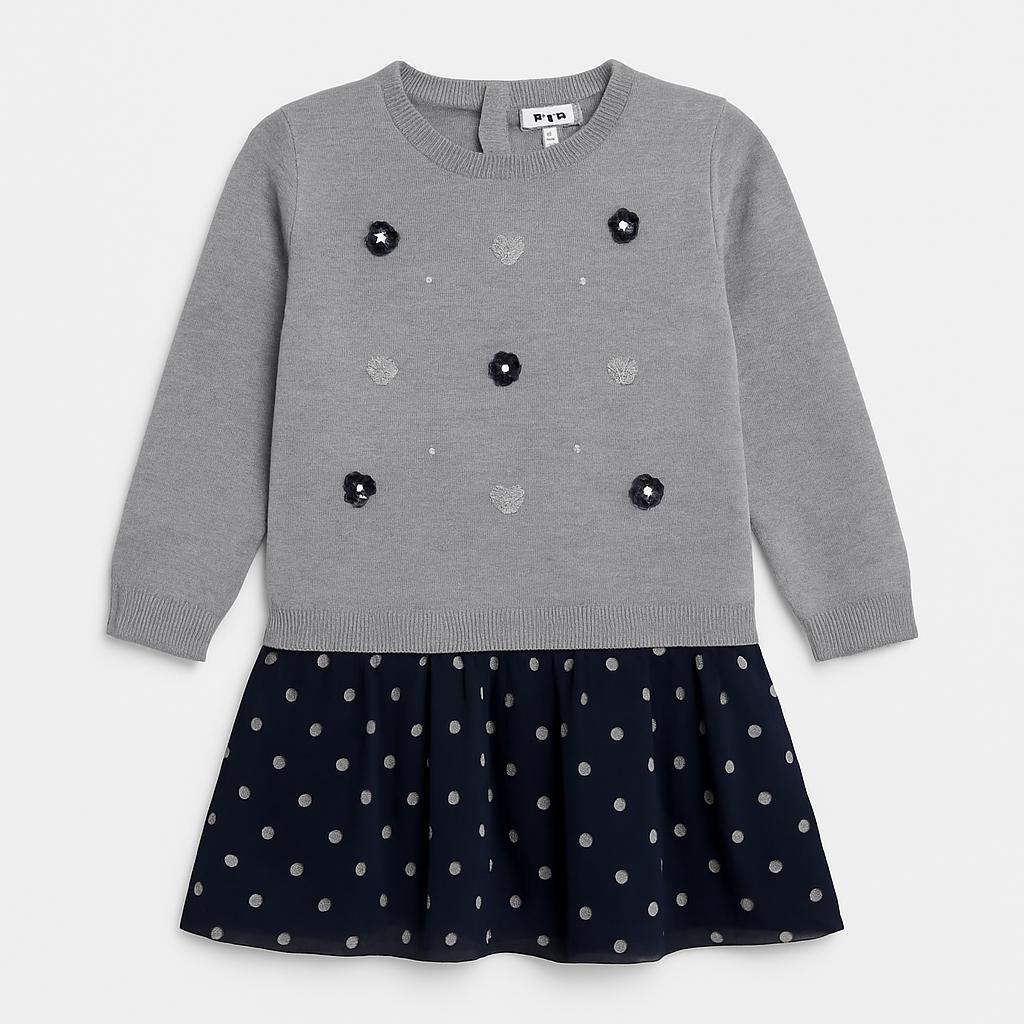 Questo adorabile abito grigio con gonna a pois è un vero tesoro per le piccole fashioniste! Il top in morbido maglione offre comfort e calore, mentre il trendy punto di blu navy con pois bianchi aggiunge un tocco di allegria. Decorato con fiori ricamati e piccoli dettagli scintillanti, rende ogni occasione speciale. Le maniche lunghe e il taglio svasato della gonna permettono libertà di movimento per giocare e divertirsi. Un capo usato in ottime condizioni che farà brillare il guardaroba della tua bimba!