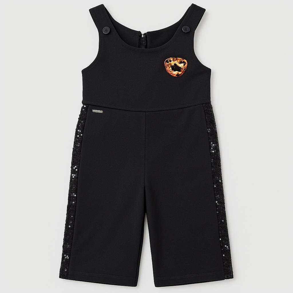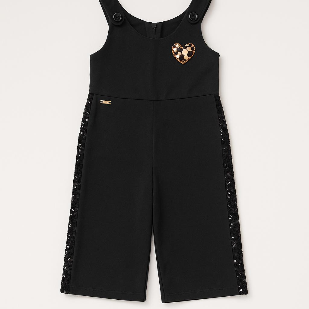 Questa adorabile salopette nera è un capo versatile e alla moda per la tua piccola! Realizzata in morbido cotone, offre comfort e libertà di movimento. I bellissimi dettagli in paillettes lungo i lati aggiungono un tocco scintillante, perfetto per ogni occasione. La chiusura con bottoni e il grazioso cuore decorativo rendono questo outfit irresistibile. Ideale per giochi e avventure, può essere facilmente abbinata a t-shirt colorate o accessori divertenti. Un must-have per il guardaroba delle piccole trendsetter!