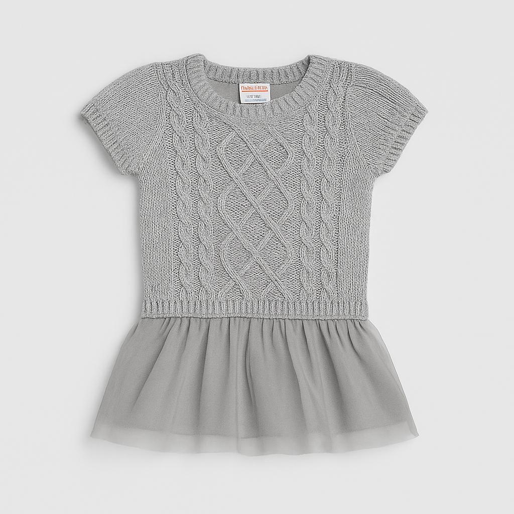 Scopri questa adorabile maglietta grigia con gonna in tulle, perfetta per le piccole fashioniste! Realizzata in un morbido tessuto lavorato a maglia, presenta un delizioso design a trecce che aggiunge un tocco elegante. La gonna in tulle trasparente, leggera e vaporosa, fa sì che questo capo sia ideale per feste, occasioni speciali o anche per un look casual chic. Le maniche corte la rendono comoda e fresca, mentre il colore neutro permette di abbinarla facilmente. Anche se usata, si presenta in ottime condizioni, pronta a regalare sorrisi e stile!