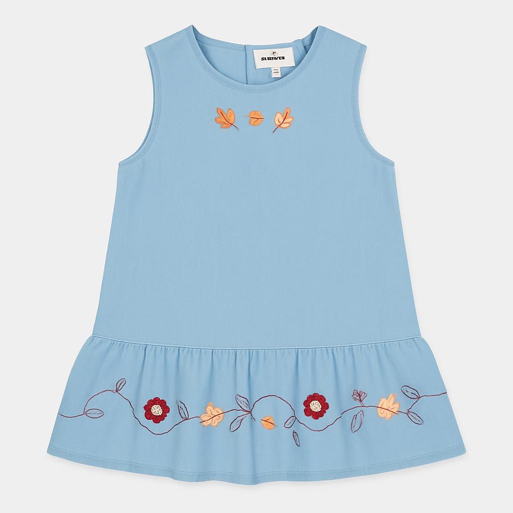 Questo adorabile vestito di denim azzurro dispone di un design fresco e primaverile, perfetto per le piccole esploratrici! Decorato con graziosi ricami floreali e foglie, aggiunge un tocco di dolcezza. La gonna a ruota e il taglio senza maniche garantiscono libertà di movimento per giocare e divertirsi. Nonostante sia un capo usato, si trova in ottime condizioni e pronta per nuove avventure. Semplice da abbinare, è ideale per passeggiate all'aperto o feste con gli amici. Un must-have per il guardaroba estivo delle piccole!