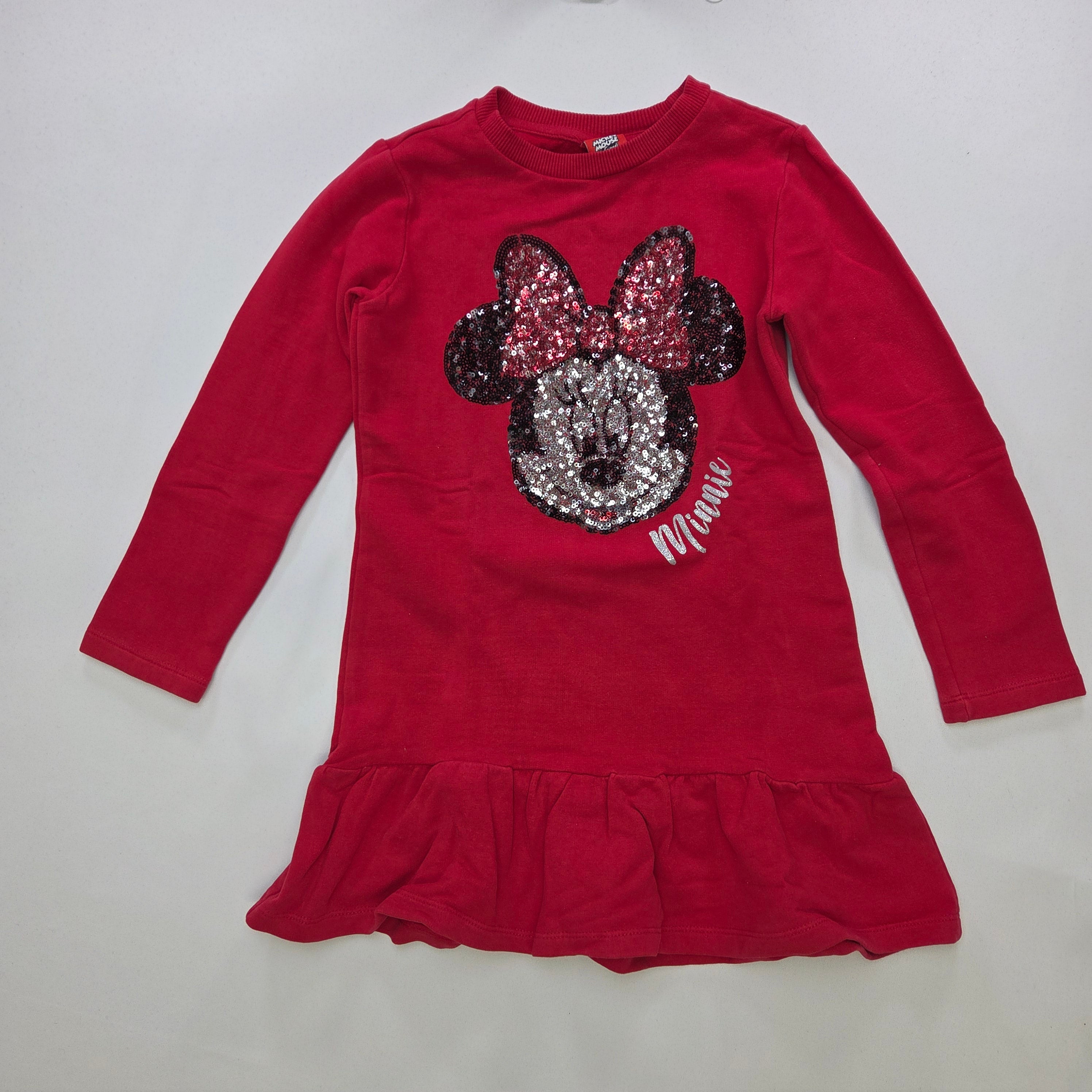 Questo incantevole vestito rosso di Minnie Mouse è ideale per le piccole fashioniste! Realizzato in un morbido cotone, presenta una dolce applicazione di paillettes che illumina il volto sorridente di Minnie. Con maniche lunghe e una graziosa gonna a balze, è perfetto per le occasioni speciali o una giornata di gioco. Nonostante sia un capo usato, si presenta in ottime condizioni e porta con sé un tocco di magia Disney, rendendolo un must-have per ogni piccola amante delle favole!