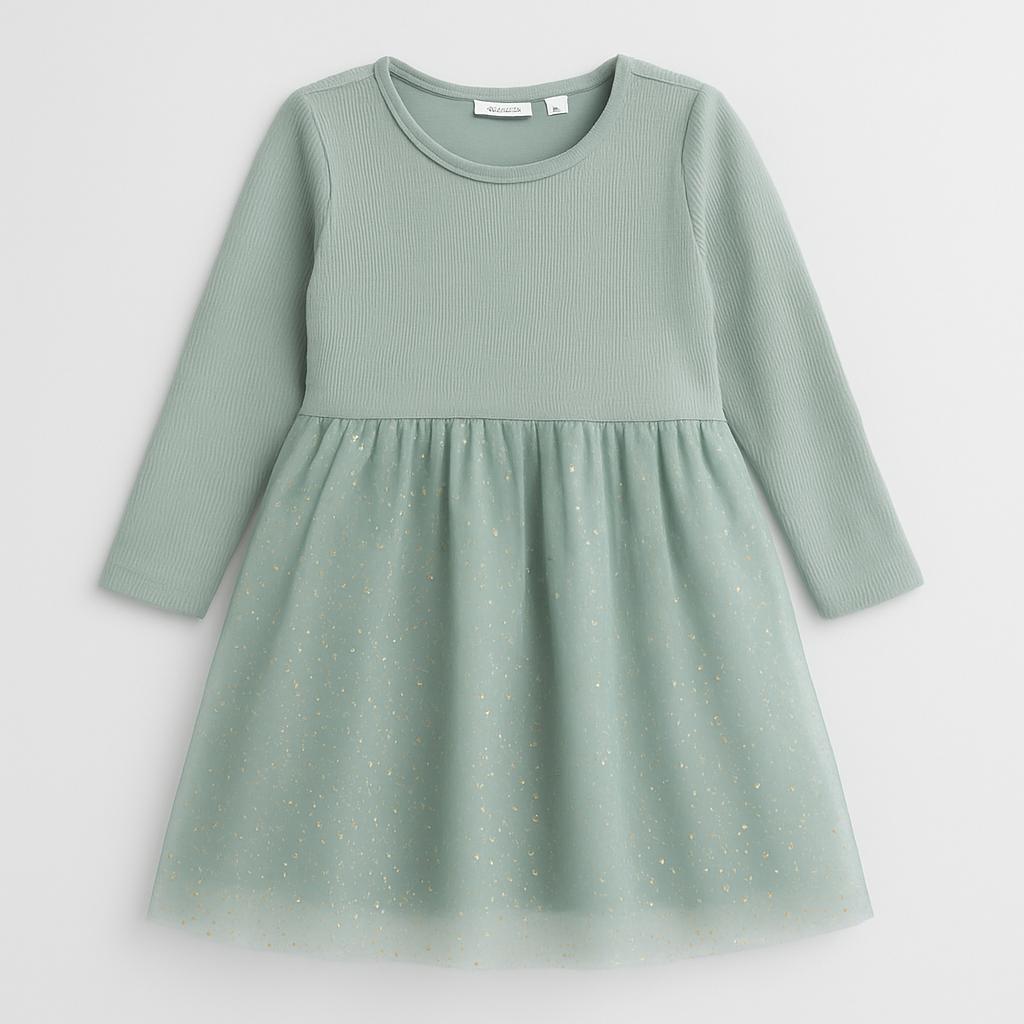 Questo incantevole abito in stile primaverile è perfetto per le piccole principesse! Realizzato con una parte superiore in morbido tessuto a coste color verde menta e una gonna in tulle trasparente decorata con scintillanti punti oro, questo vestito unisce eleganza e comfort. Le maniche lunghe offrono calore durante le fresche giornate, mentre il design luminoso e giocoso permette di brillare in ogni occasione. Nonostante sia un capo usato, si presenta in ottime condizioni, pronto a far sognare la tua bimba nei giochi e nelle feste! Un'ottima scelta per chi ama sentirsi speciale!
