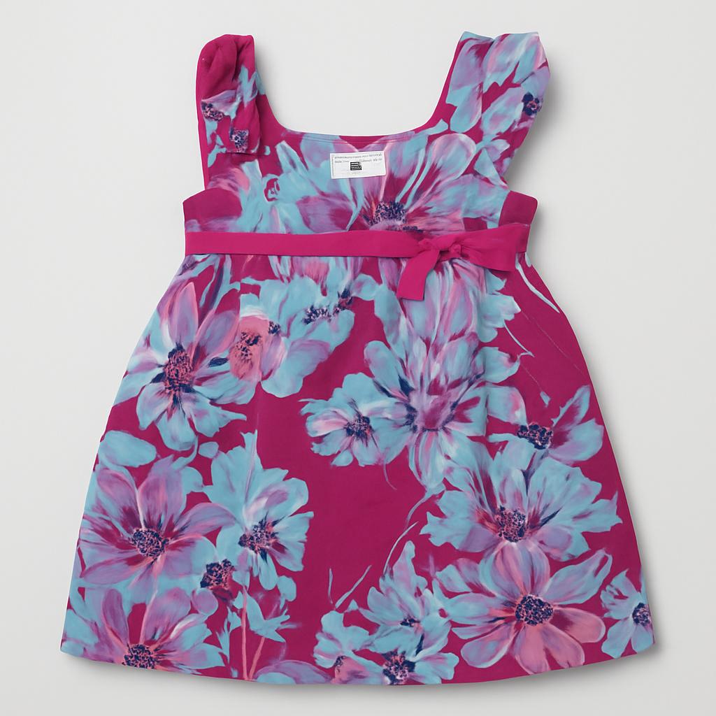 Questo meraviglioso vestito floreale farà sentire la tua piccola una vera principessa! Con un vivace fondo fucsia e graziosi motivi di fiori in tonalità azzurre e viola, è perfetto per le occasioni speciali e le giornate estive. Le spalline delicate e il taglio ampio rendono questo abito non solo elegante, ma anche comodo per muoversi e giocare. Nonostante sia un capo usato, si presenta in ottime condizioni, pronto per essere indossato e amato ancora. Un'aggiunta irresistibile al guardaroba della tua mini fashionista!