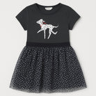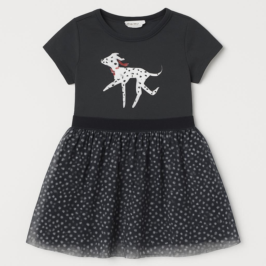 Questo adorabile abito per bambine è un mix perfetto di stile e gioco! La parte superiore in cotone morbido è di un elegante grigio scuro, adornata da un simpatico disegno di un cagnolino maculato, con un grazioso fiocco rosso che gli conferisce un tocco di dolcezza. La gonna, realizzata in leggera organza nera con pois bianchi, dona un aspetto sbarazzino e fanciful, perfetto per ogni piccola amante della moda. Con le sue maniche corte e la vita elastica, questo vestito garantisce comfort e libertà di movimento per corse e giochi. Anche se di seconda mano, è in ottime condizioni e pronto a far brillare il guardaroba di una giovane sognatrice! Un capo essenziale per le occasioni speciali o le avventure quotidiane!