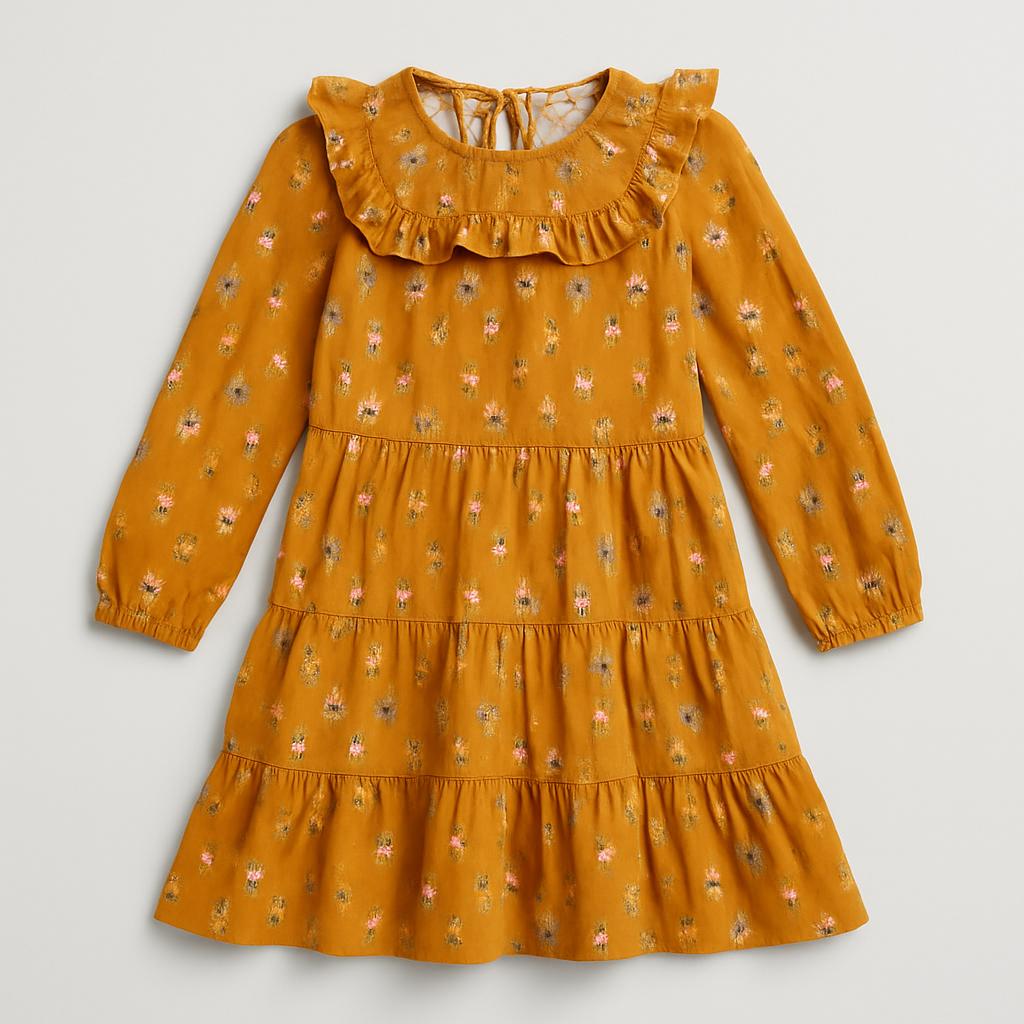 Questo incantevole abito, in una calda sfumatura di giallo senape, è perfetto per le piccole sognatrici! Decorato con delicati fiori colorati, dona un tocco di allegria e freschezza a ogni outfit. Le maniche lunghe e la gonna a balze offrono comfort e libertà di movimento, rendendolo ideale per le avventure quotidiane. Le rifiniture fluttuanti e il colletto rendono questo vestito ancora più speciale, perfetto per feste, occasioni speciali o semplicemente per sentirsi uniche. Anche se è un pezzo usato, la sua qualità è evidente e porterà sicuramente un sorriso al volto della tua piccola!