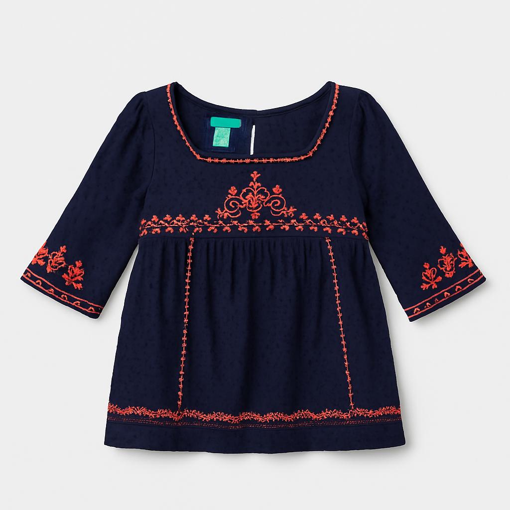 Questa deliziosa tunica blu scuro è un vero tesoro per il guardaroba della tua piccola! Con elegantissimi ricami in un vivace colore corallo, aggiunge un tocco di freschezza e stile. Le maniche a tre quarti e il taglio morbido offrono comfort e libertà di movimento, ideali per ogni avventura. Perfetta per abbinamenti con jeans o leggings, questa tunica è un capo usato ma in ottime condizioni, pronto a far brillare il look delle giovani trendsetter. Il suo design classico e sbarazzino farà sentire ogni bambina una vera protagonista!