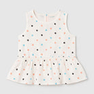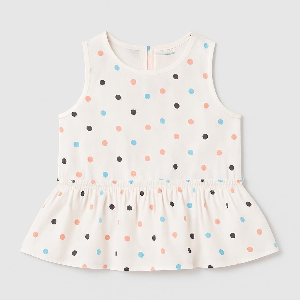 Questo adorabile top per bambine è il pezzo perfetto per l'estate! Con una dolce stampa a pois in diverse tonalità di blu, arancione e nero, rende ogni outfit unico e colorato. Realizzato in morbido cotone, è leggero e traspirante per garantire il massimo comfort durante le giornate di sole. Il taglio svasato con volant in vita aggiunge un tocco di eleganza e giocosità, perfetto per le piccole principesse in movimento. Nonostante sia usato, è in ottime condizioni e pronto per una nuova avventura nel guardaroba della tua bimba! Un must-have per ogni piccola amante della moda!