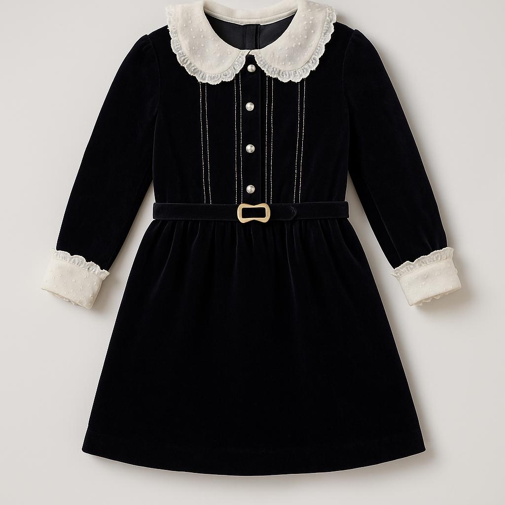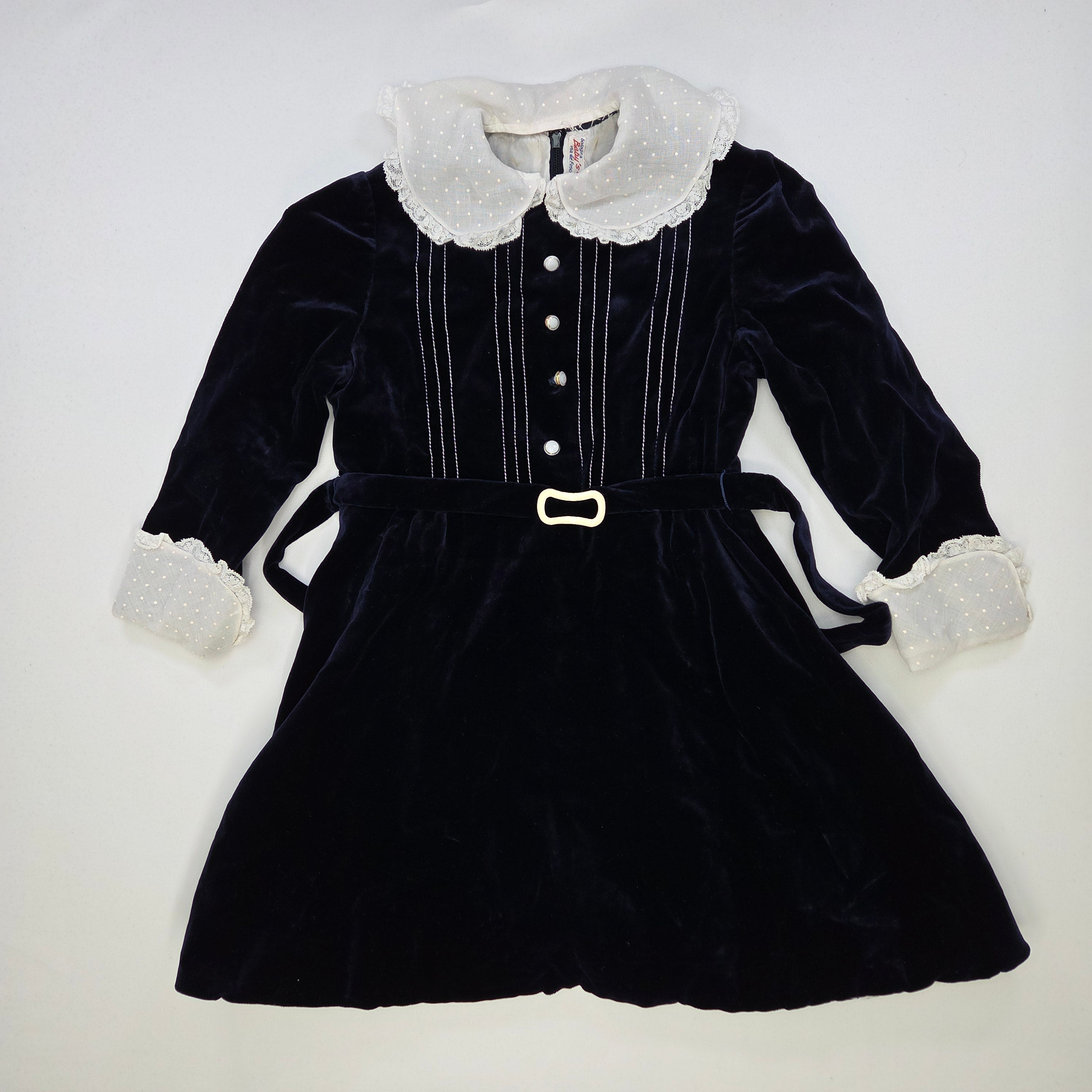 Questo delizioso vestito in velluto nero è un vero e proprio sogno per le piccole principesse! Con una dolce collarina bianca in pizzo e bottoni scintillanti, aggiunge un tocco di eleganza a ogni occasione. Le maniche lunghe e il morbido tessuto lo rendono perfetto per i giorni più freschi. La cintura in vita esalta la silhouette, mentre il suo design classico e raffinato si presta a feste e momenti speciali. Anche se usato, è in ottime condizioni, pronto a regalare momenti indimenticabili alla tua bimba!