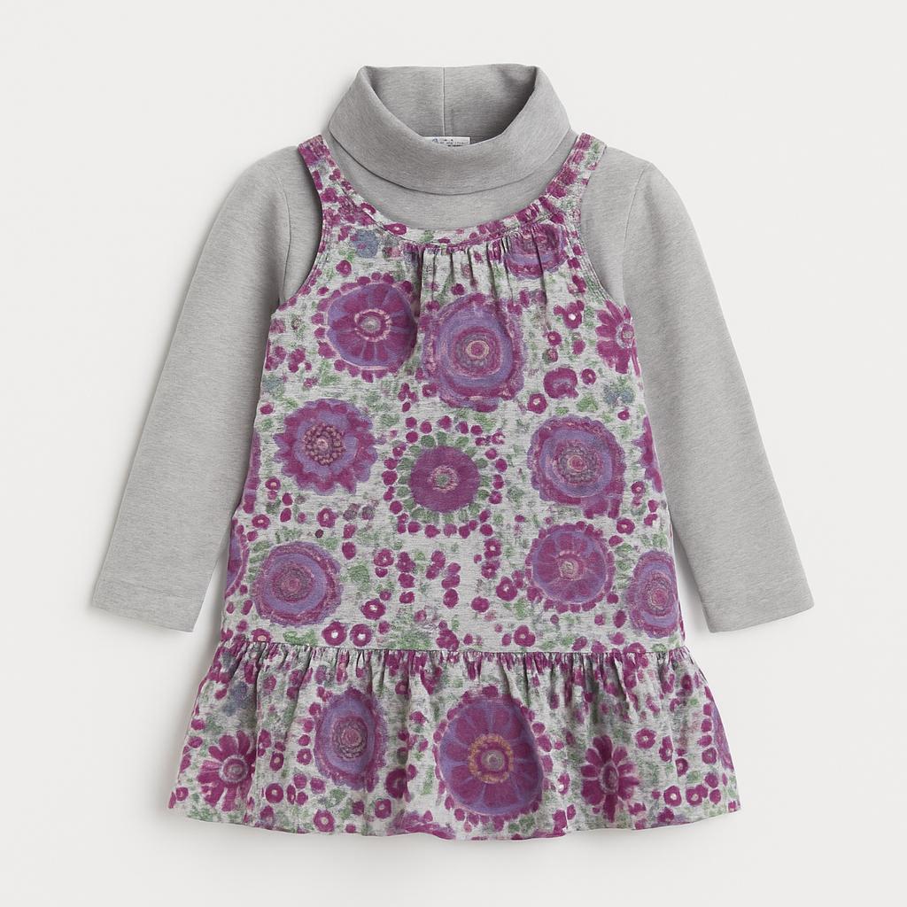 Questo adorabile completo per bambine è un mix perfetto di comfort e stile! La felpa grigia a maniche lunghe è abbinata a un vestitino grigio chiaro con un vivace motivo floreale nei toni del viola e del verde. Con un taglio ampio e grazioso, il vestitino presenta una gonna arricciata che aggiunge movimento e divertimento ad ogni passo. Ideale per la stagione autunnale, questo outfit è perfetto per le avventure quotidiane delle piccole esploratrici. Anche se usato, si presenta in ottime condizioni, pronto a regalare sorrisi e gioia!