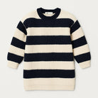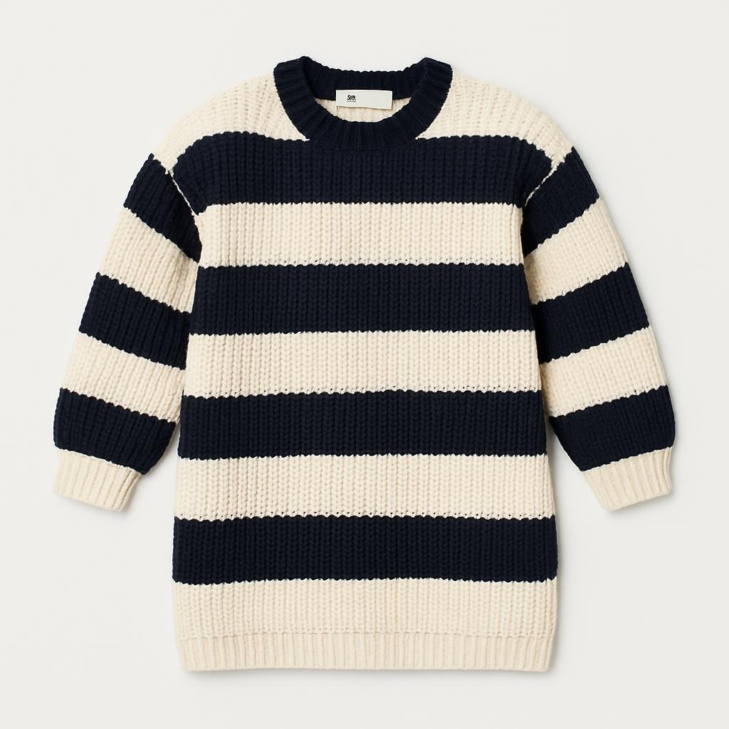 Questo adorabile maglione a righe è l'ideale per le giornate fresche! Con il suo design a righe navy e crema, porta un tocco di eleganza al guardaroba del tuo piccolo. Realizzato in un morbido tessuto lavorato a maglia, garantisce comfort e calore, mentre le maniche lunghe e il taglio ampio lo rendono perfetto per una vestibilità libera e divertente. Nonostante sia usato, si presenta in ottime condizioni, pronto per accompagnare le avventure invernali. Un capo essenziale per ogni bambino che ama giocare con stile!