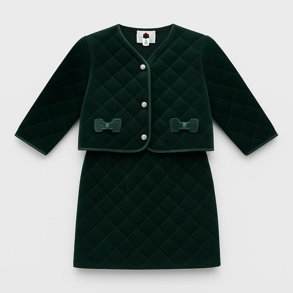 Questo adorabile completo in velluto verde smeraldo è perfetto per le piccole che amano essere eleganti e comode! Composto da una giacca con bottoni e un’accattivante gonna, il set è adornato da simpatiche fiocchetti sui taschini, aggiungendo un tocco di dolcezza. Il tessuto morbido e caldo lo rende ideale per le giornate fresche. Nonostante sia un capo usato, è in ottime condizioni e pronto a vestire la tua piccola con stile e classe. Un outfit perfetto per eventi speciali o per un look raffinato anche nella quotidianità!