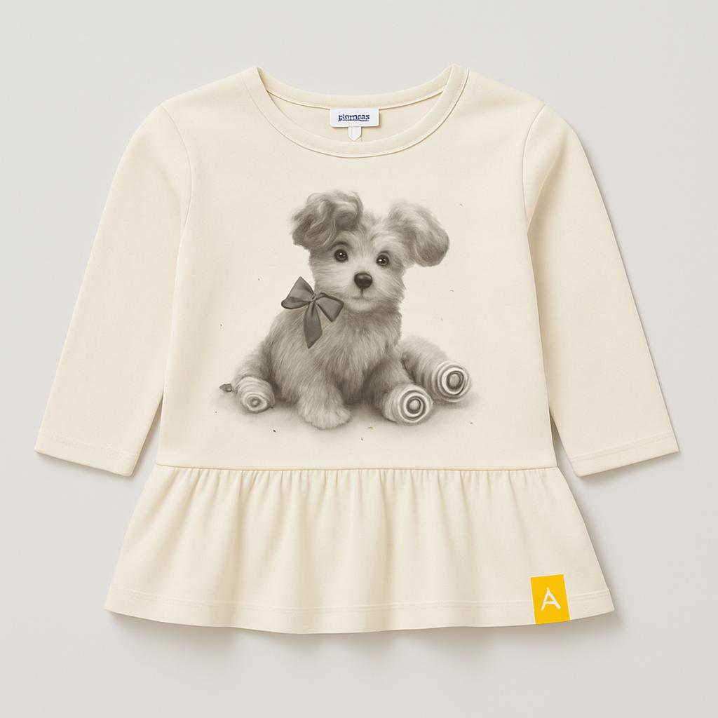Questa adorabile maglietta bianca per bambini è perfetta per le piccole amanti degli animali! Con un dolcissimo motivo che ritrae un cagnolino in primo piano, questa maglietta a maniche lunghe non solo è tenera, ma anche comoda grazie al suo tessuto morbido. Il taglio a peplum dona una nota trendy e femminile, mentre il dettagliato ricamo e il fiocco sul collare del cucciolo aggiungono un tocco di charme. Anche se usata, si presenta in ottime condizioni, pronta per accompagnare la tua piccola in avventure giornaliere con stile! Un capo indispensabile per le giornate all'insegna del divertimento e dell’affetto!