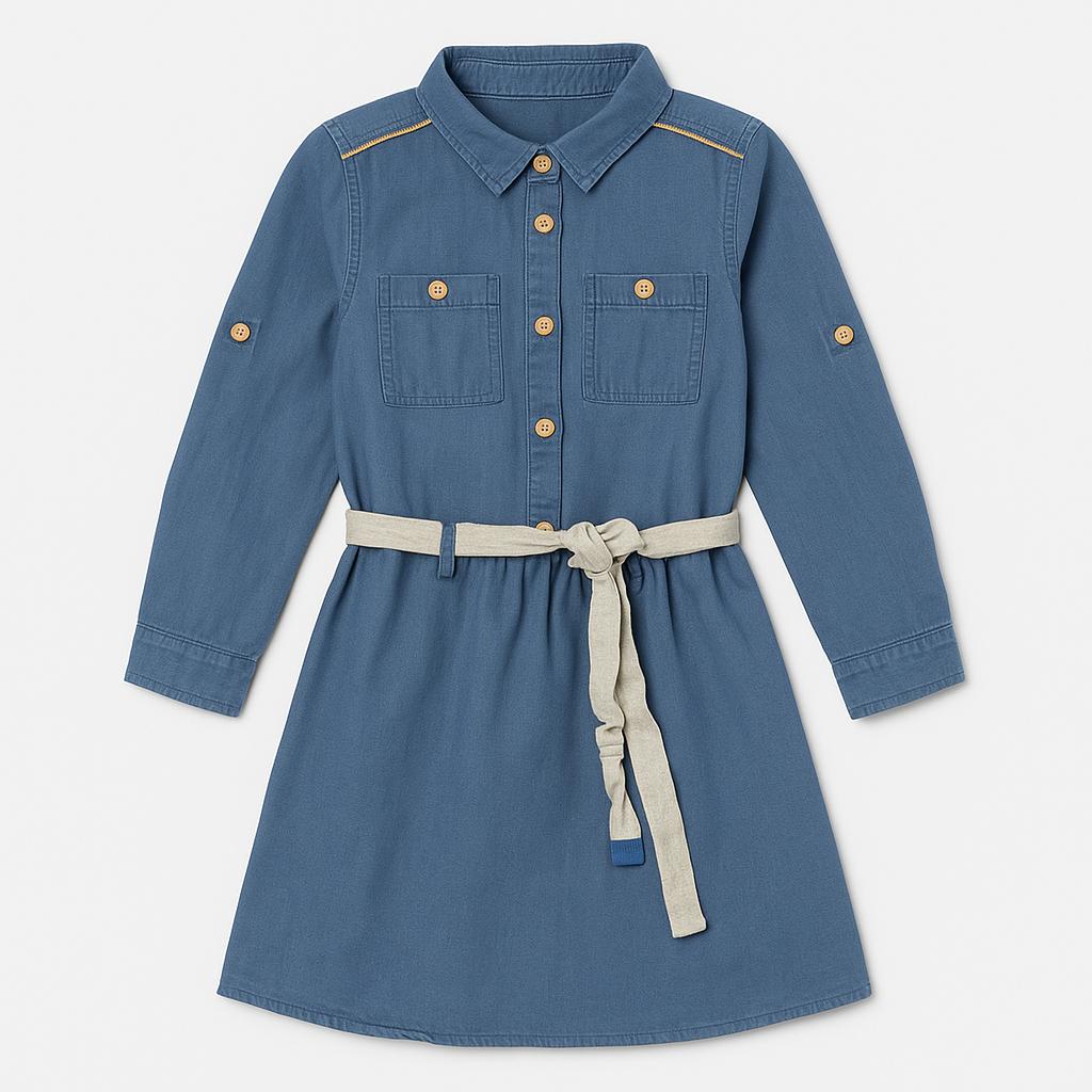Questo adorabile abito in denim è l'ideale per la tua piccola esploratrice! Con un fresco e versatile color blu, presenta un colletto elegante e bottoni dorati che aggiungono un tocco chic. Le due tasche sul petto danno un'aria giocosa, mentre la cintura in vita, in morbido cotone, valorizza la silhouette. Le maniche lunghe sono perfette per le fresche serate primaverili o autunnali. Nonostante sia un capo usato, si presenta in ottime condizioni, pronto a far sentire la tua bimba alla moda in ogni occasione! Un vero must-have per il guardaroba di ogni piccola stilista!